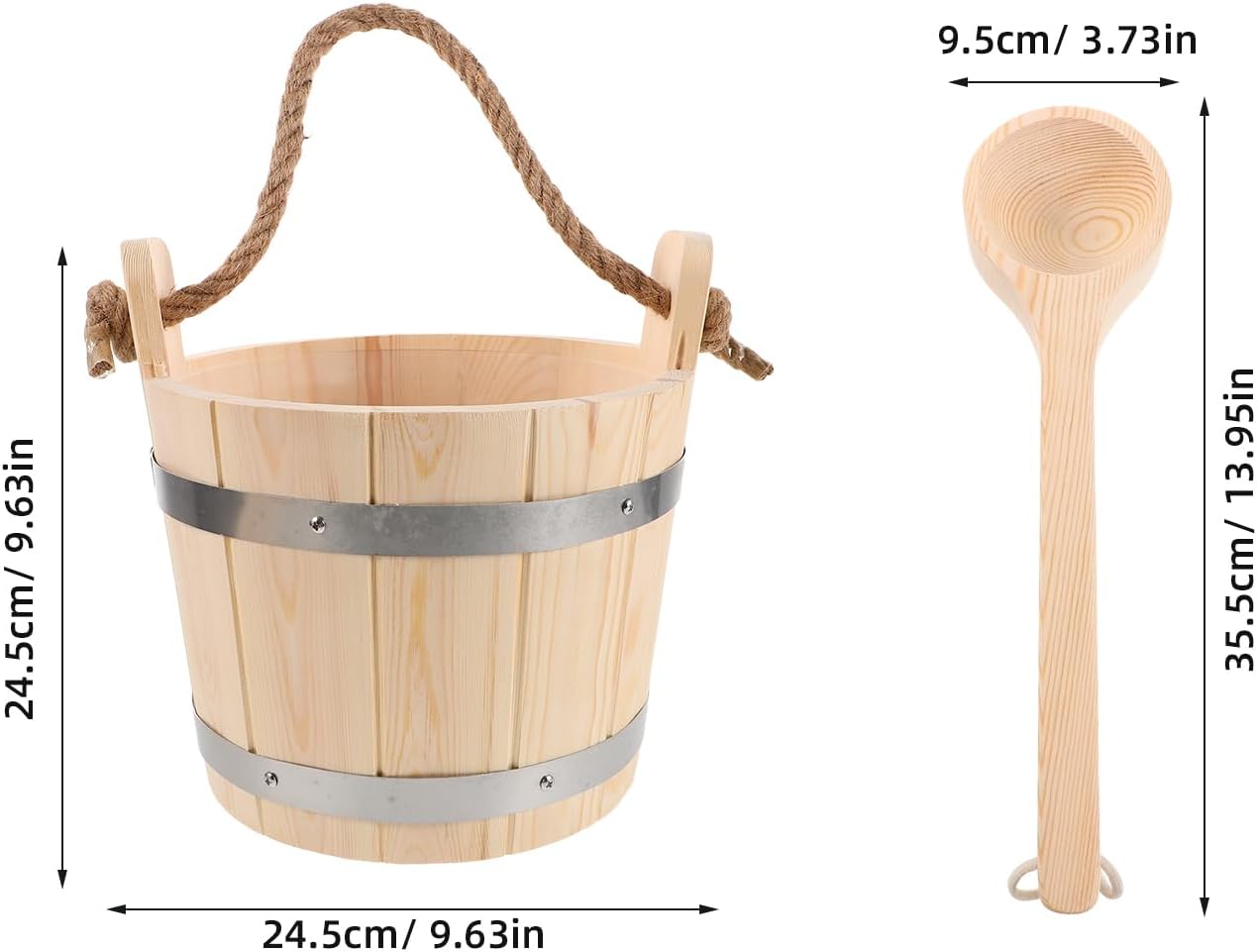 Description This wooden bucket is designed for saunas, providing a traditional and authentic experience. Crafted from wood, it is for pouring water over hot sauna stones to create steam. The natural wood finish adds a rustic touch to your sauna, enhancing the overall ambiance and relaxation. Features -Color:Beige -Material:Wood -Size:24.50X24.50X24.50cm/9.63X9.63X9.63in -Size:35.50X9.50X4.00cm/13.95X3.73X1.57in -Portable design: the wooden bucket features a convenient handle, making it easy to carry and use in various locations, allowing you to enjoy sauna sessions anytime, anywhere -stable material: made from stable wood, this bucket is heat resistant and maintains its shape, ensuring performance in sauna or steam room environments -Versatile usage: for sauna rooms, showers, or even garden watering, this multifunctional bucket adapts to different needs, adding practicality to your daily routine -Relaxation enhancer: ideal for home or professional sauna setups, it elevates your sauna experience -Included ladle: comes with a matching wooden ladle, making it easy to scoop and pour water during sauna sessions, enhancing convenience and usability