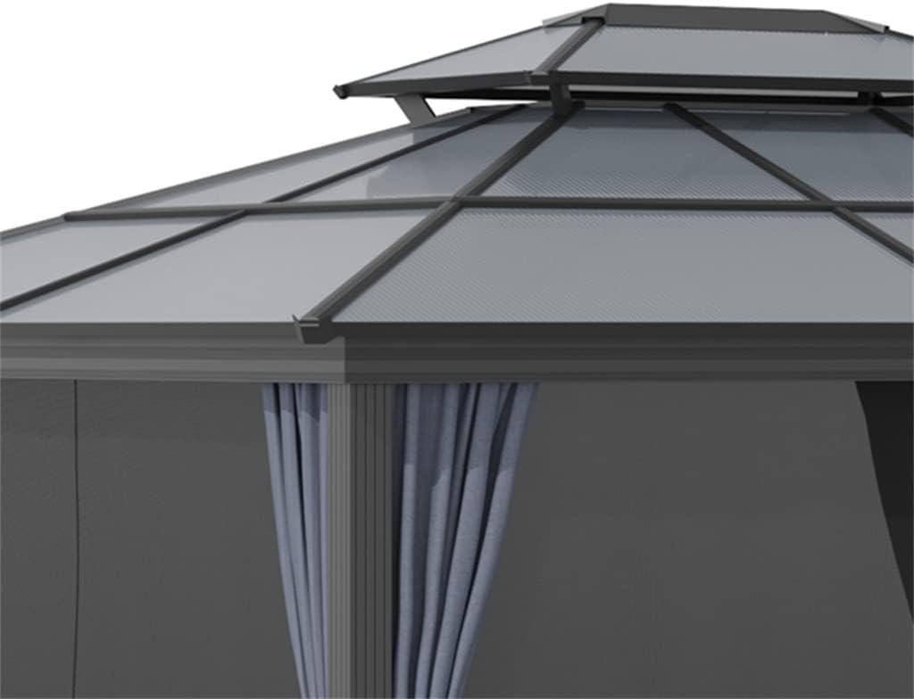 Features:- Practical gazebo with tall and spacious design-Metal and aluminum frame for a stable structure- Polycarbonates hardtop to provide UV protection- Two-tiered roof allows good airflow- Breathable mesh sidewalls and curtains create a comfortable space- for use in the backyard, lawn, poolside and more- Expansion screws and ground stakes for extra stability- Assembly requiredSpecification:- Color: Black- Material: Metal, Aluminum, PC, Breathable Mesh, Polyester- Overall Dimension: 11.8' L x 9.8' W x 9.7' H- Eave Height: 6.7'- Distance between Columns: 10.1' L x 8' W- Windproof level: 6 (39-49km/h 24.5-30.5mph)24.5-30.5mph)- Snow load capacity: 200lbs- Item Label: - 1 x gazebo- 8 x expansion screws- 12 x ground stakes- 1 x manual(Other demo items not included).Note:Due to different monitors and lighting effects, the actual colour of the product may differ slightly from the colour shown in the pictures. Thank you!Please allow 1-2 cm deviation due to manual measurement.The side wall of the net blocks unwanted guests with wings, and the side curtains can prevent wet environment.