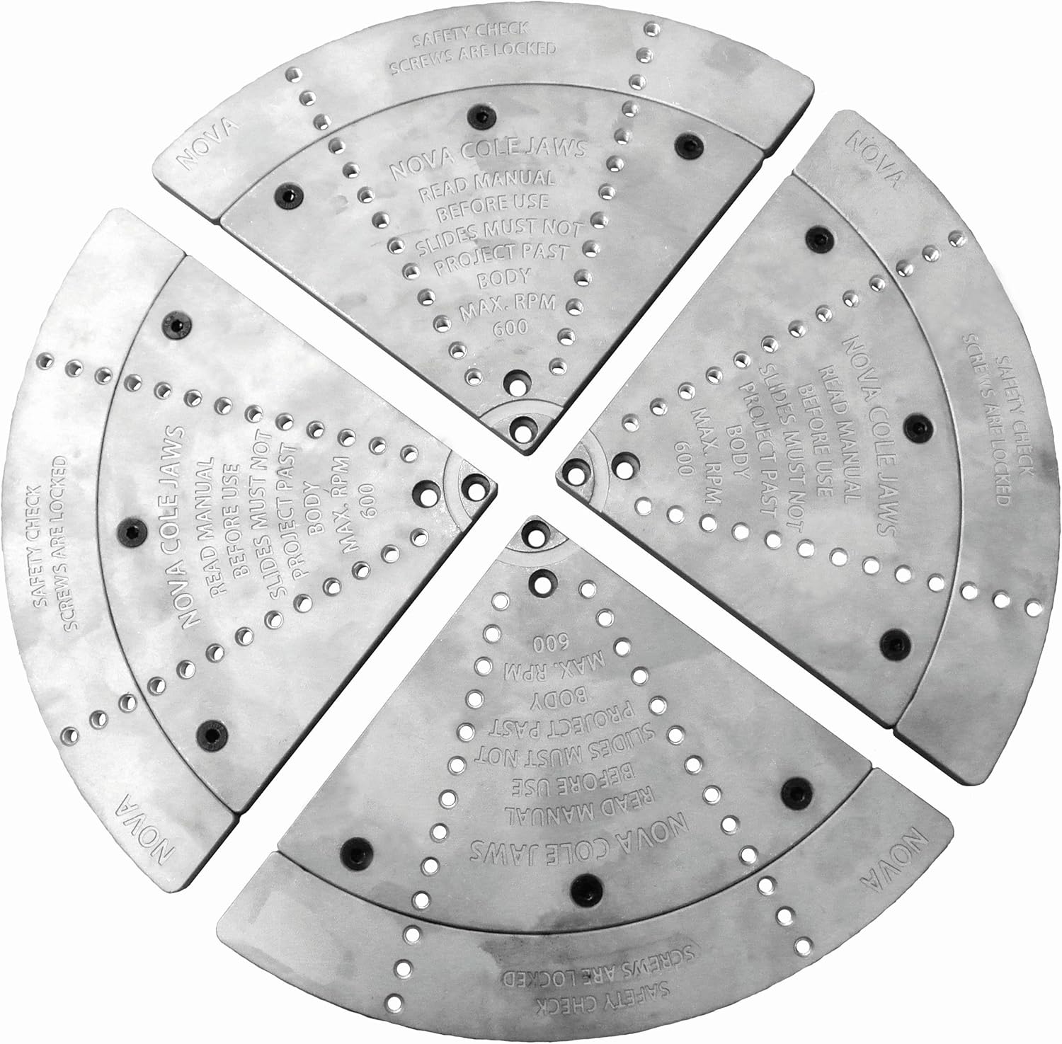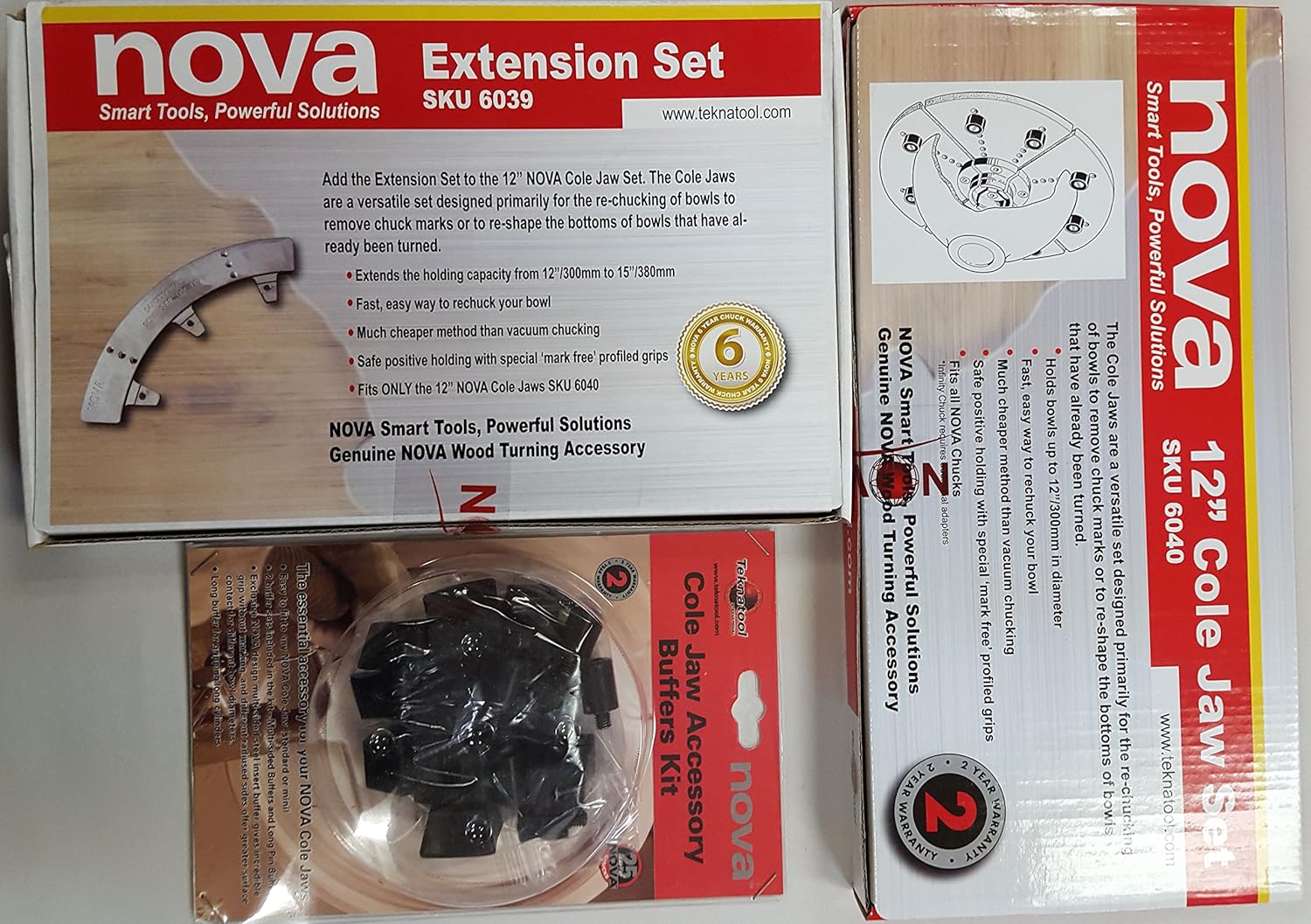 The Nova 12" Cole jaws are a very versatile set designed primarily for the re-chucking of bowls to remove chuck marks or to re-shape the bottom of bowls that have already been turned. This package includes the 12-15" adaptors for very large bowls (for lathes 16" swing or larger only). There is also provision to mount the 50mm, Step, and 100mm jaws onto the Cole jaws which enhances their use considerably. All the facilities of the other jaw sets can be fully utilised in conjunction with the Cole jaws. These jaws more than any other really begin to explore the tremendous versatility of the Nova Chuck. A special woodworm screw (optional) can be used for initial bowl mounting. With this combination of holding methods, it is possible to turn a bowl from rough blank to a completely finished smooth bowl with just this one jaw set. The Nova Chuck Cole jaw combination is the only chucking system to allow such a complete facility without any complex jaw changes or different set ups. There are a number of re-chucking options; false wooden jaws can be added, wooden dowels used or rubber stoppers which are provided with the basic kit. This package also includes the Nova 6030 accessory buffer kit for more versatile work holding.