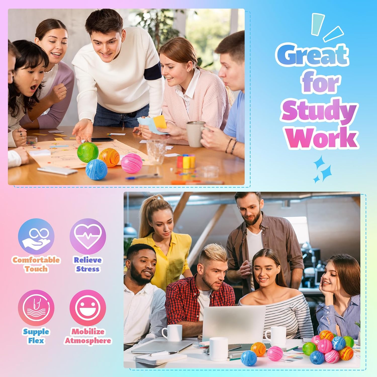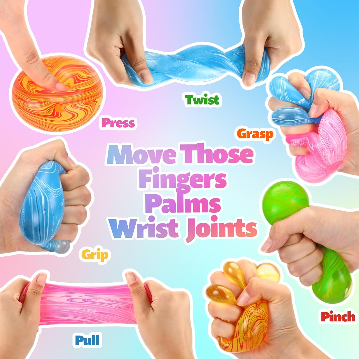 Features: This value pack includes 12 soft, slow‑rising fidget stress balls in blended blue, pink, orange, and green gradients. They feature a thermoplastic rubber shell filled with syrup for a leak‑proof, durable, gentle squeeze that slowly returns to shape. Designed to provide tactile, calming relief for stress, anxiety, and ADHD, they're lightweight and portable for use at work, travel, or home. These colorful sensory cubes also make thoughtful gifts, party favors, or stocking stuffers. Specifications: Material: rubber Color: blue, pink, orange, and green Size: each approximately 2.4 inches/6 cm in diameter Package includes: 12 x Fidget stress balls Notes: Manual measurement, please allow slight errors on size. The color may exist a slight difference due to different screen displays.