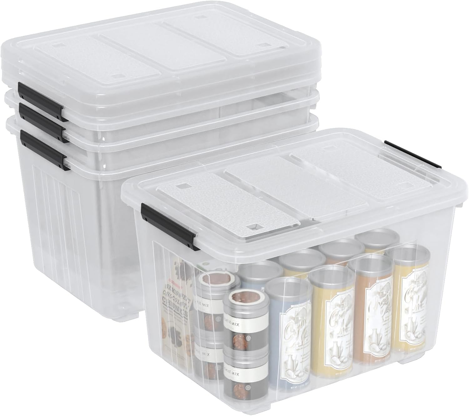 4 pack clear storage boxes are made of premium plastic, with a capacity of 20 liters and dimensions of 15.35" x 11.14" x 9.25", portable and versatile, can store beverages, snacks, stationery, gifts, cosmetics, medicines, etc.
