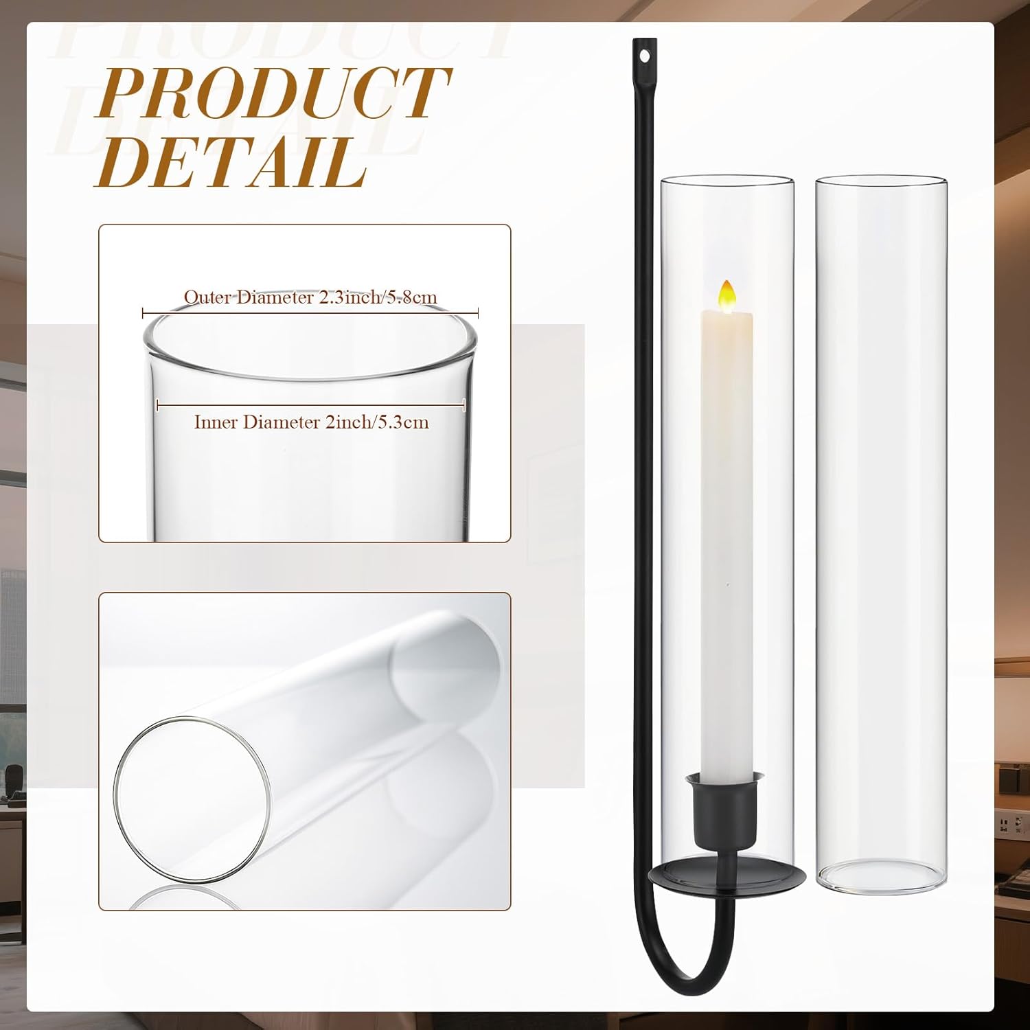 Features: These candle holders for wall can be a house warming gift for your friends and family in different occasions, especially wedding, Halloween, Christmas, birthday, housewarming and so on. These wall candle sconces holder made of strong wrought iron and finished with a black matte powder coating, it will not fade, deform and can be applied for many years. Specifications: Material: iron Color: black Size: The hurricane candleholders is about 2.3 x 11.8 inches The black wall candle holder is about 15.8 x 4 x 2.68 inches Package includes: 4 x Clear glass hurricane candleholders 4 x Black wall candle sconce 4 x Expansion screws 4 x Nails Notes: Manual measurement, please allow slight errors on size. The color may exist a slight difference due to different screen displays.