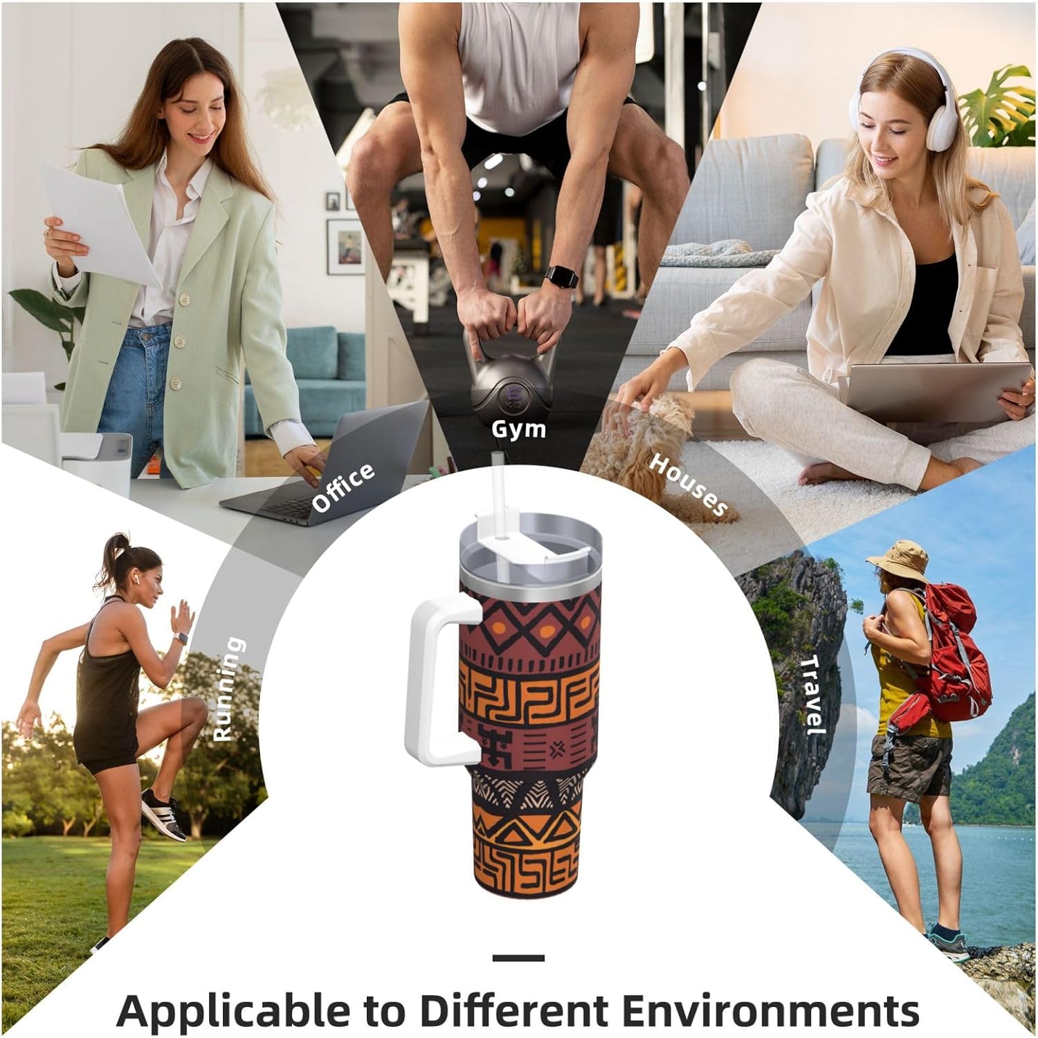 This African Mud Cloth Tribal Print Ice Bully Cup features a double layer stainless steel design that can be used for a long time without rusting. The lid has good sealing to prevent water from overflowing, and it is easy to unscrew for filling and cleaning. It can keep water, coffee, or drinks warm or cool for hours and is suitable for travel, camping, and driving.