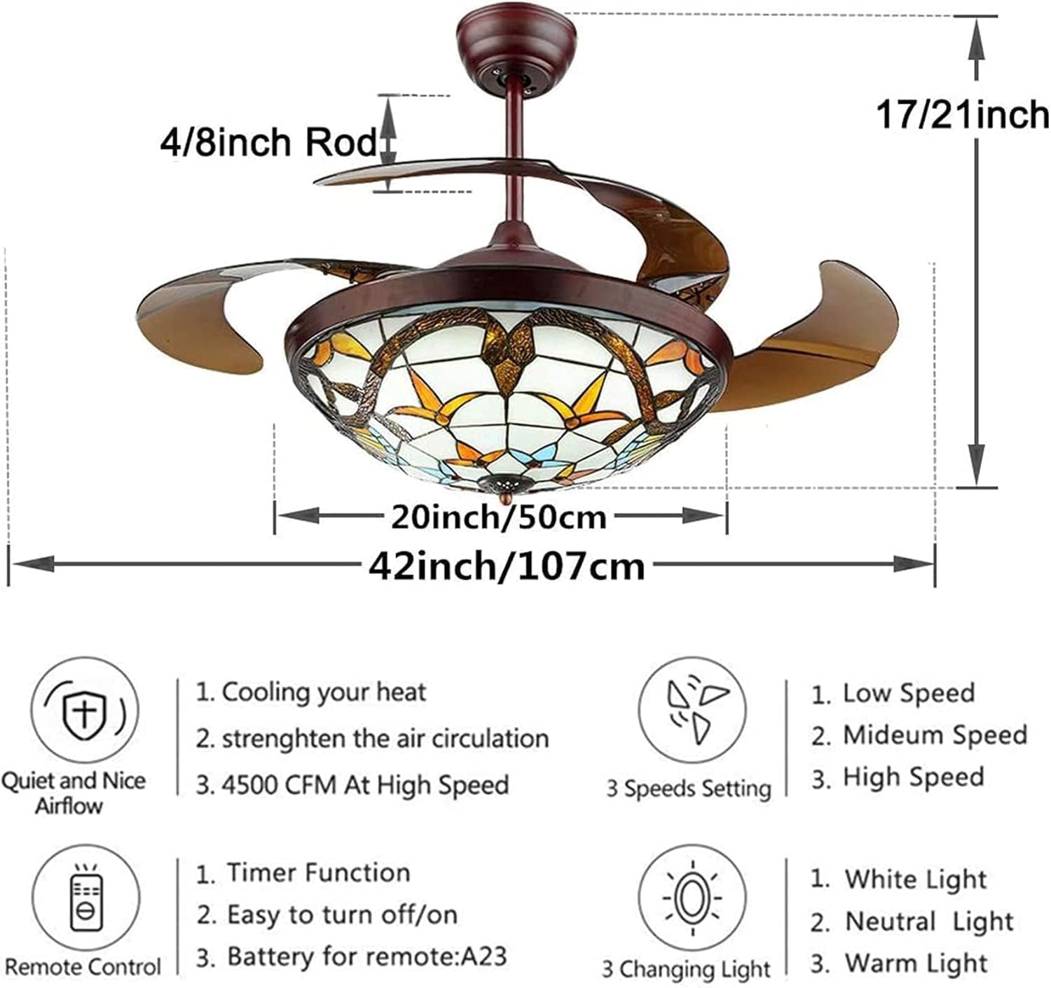 Tiffany-Style Ceiling Fan Light Fixture Product information: Color: Brown Wattage: 36W Voltage: 110V Net Weight: 26.39lb Material: Metal, crystal, ABS Switch: Remote control Height:21.65"(With Pendant) Lenght:42.13" Package include: Tiffany style ceiling fan and light 42" x 1 Screws sets x 1 Remote control x 1 Installation instructions x 1 Package information: Size: 21.65" x 21.65" x 15.35" Volume-weight: 43.34lb Why choose us? Good Quality Careful Design Safe After-Sales Important Notes: 1. It is recommended that the chandelier needs to be installed by a professional electrician. 2. Due to transportation issues, if there is a problem with some parts of the lamp, please contact us and we can reissue it for free. 3.In order to avoid disturbing you, if you need installation help, please contact us, we will provide you with the most comprehensive and patient service. Warranty: If any part of the chandelier is damaged, you can contact us and we will arrange a replacement for you, we can provide replacement or return service if manufacturing defects occur within 60 days after purchase and any dissatisfaction within 30 days, provide a two-year warranty after-sales service.Your satisfaction is our goal. If you have any questions after order, please contact us freely.