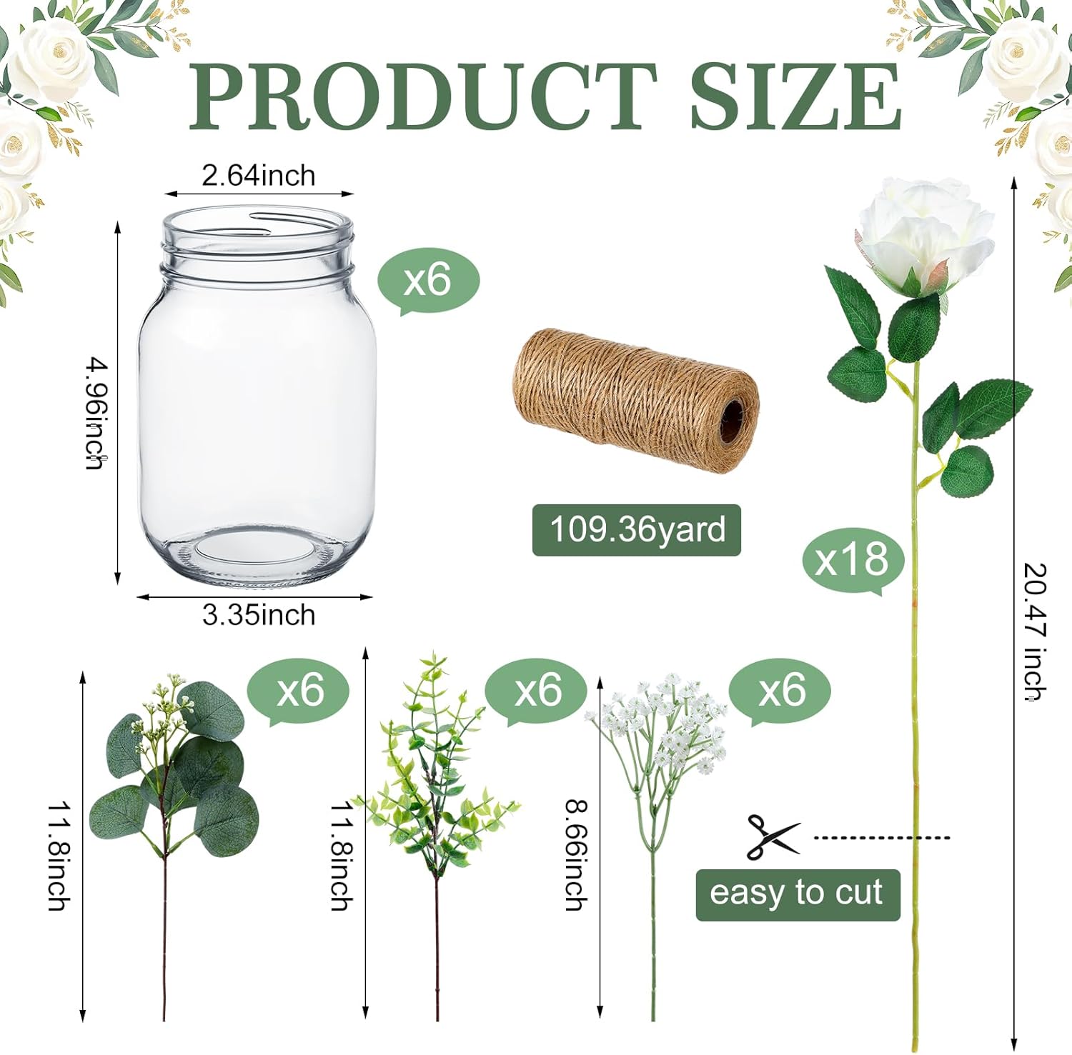 | Included Components | 12 x Fake eucalyptus leaves, 18 x Faux rose flowers, 6 x Faux baby's breaths, 6 x Mason jars |