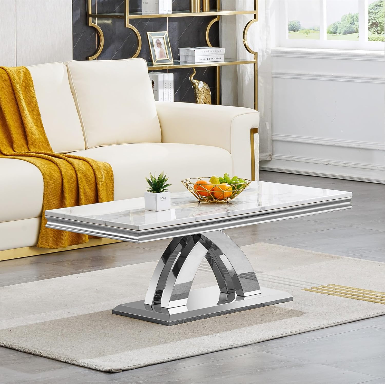 ❀Introductions:Rectangular coffee table of modern design with fixed 0.71" marble printing MDF top and smooth edges. Its U-shape stainless steel base with silver mirrored finish is one of the key elements to highlight in its design. A perfect table to bring the elegance and avant-garde style to your living room.❀Specifications:1. Product Dimension: (46.85 x 22.83 x 17.72)" (L x W x H)2. Weight Capacity: 79.37lbs3. Material: MDF + Stainless Steel❀Package Includes:1 x Luxury Coffee Table