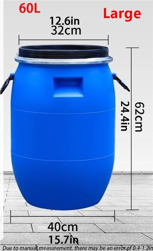 Due to manual measurement, there may be an error of 0.4-1.2in. Due to the lighting problem, there may be color difference, please refer to the actual productThis blue multi-purpose storage container is crafted from thickened, impact-resistant plastic and designed for safe, long-term storage of water, food, oil, chemicals, and other liquids or bulk materials.