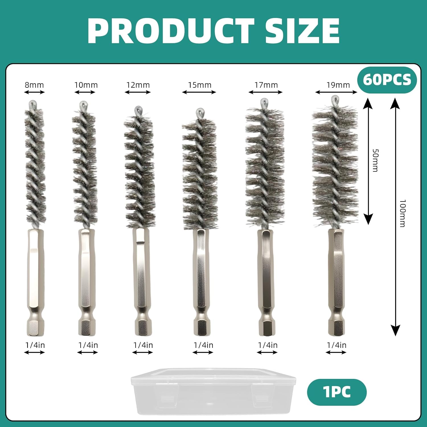 Features: Crafted from durable 304 stainless steel, these versatile bore brushes feature a universal 1/4-inch hex shank for quick drill attachment. They effortlessly clean and polish tight spaces, pipes, and small holes without surface damage, making them ideal for automotive, plumbing, and industrial tasks. The set includes six sizes (8MM-19MM) to meet diverse needs. Specifications: Material: 304 Stainless Steel Shank Type: 1/4-inch Hex Sizes Included: 8MM, 10MM, 12MM, 15MM, 17MM, 19MM Package Includes: 10 x 8MM Bore Brushes 10 x 10MM Bore Brushes 10 x 12MM Bore Brushes 10 x 15MM Bore Brushes 10 x 17MM Bore Brushes 10 x 19MM Bore Brushes Total: 60 Brushes Notes: For optimal performance and longevity, it is recommended to clean the brushes after use and store them in a dry place.