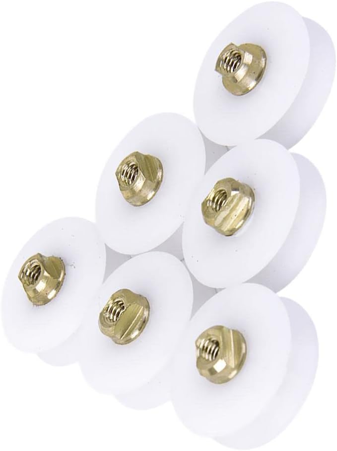 Product description Replacement shower door roller with screw to fasten roller to mount. This shower door roller will provide smooth sliding. White nylon shower door roller with brass core.Description: Internally threaded shower door rollers Designed to suit 6-8mm glass hole Roller Size (Dia. x T): Approx. 22.5 x 7 mm Thread Diameter: Approx. 4mm Material: Nylon wheel with brass core Color: WhitePackage Includes: 6 x Shower Door Roller 6 x Screw Manufacturer Contact Information LR DECOR E-SHOP, lrdecor5th@gmail.com (+91 9355385155)