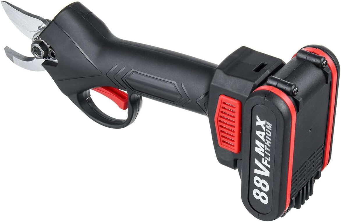 Features:1. Cordless rechargeable pruning shears for cutting and trimming branches in fruit orchards, vineyards.2. blade, made of tungsten steel, durable.3. One 9000mAh large capacity rechargeable lithium battery for cordless use.4. Ergonimic and comfortable handle.5. Low noise, good fatigue resistance.6. Flexible in use,easy to turn, safe and reliable, easy to maintain, convenient to replace battery and operate.7. The pruning quality can meet the requirements of horticulture.Specifications:1. Name: Cordless Pruning Shears2. Plug: EU Plug3. Main materials: PVC, Metal4. Color: Black5. Battery: 88V 9000mAh6. Charging Voltage: 110-220V7. Charging Time: 1-1.5h8. Working Time: 3-4h9. For Peak Power: 500W10. Rated Power: 100W11. Max. Cutting: 30mm12. Working Temperature: -10℃~60℃Package included:1 X Pruning Shears1 X Battery1 X Adapter1 X Plastic Box