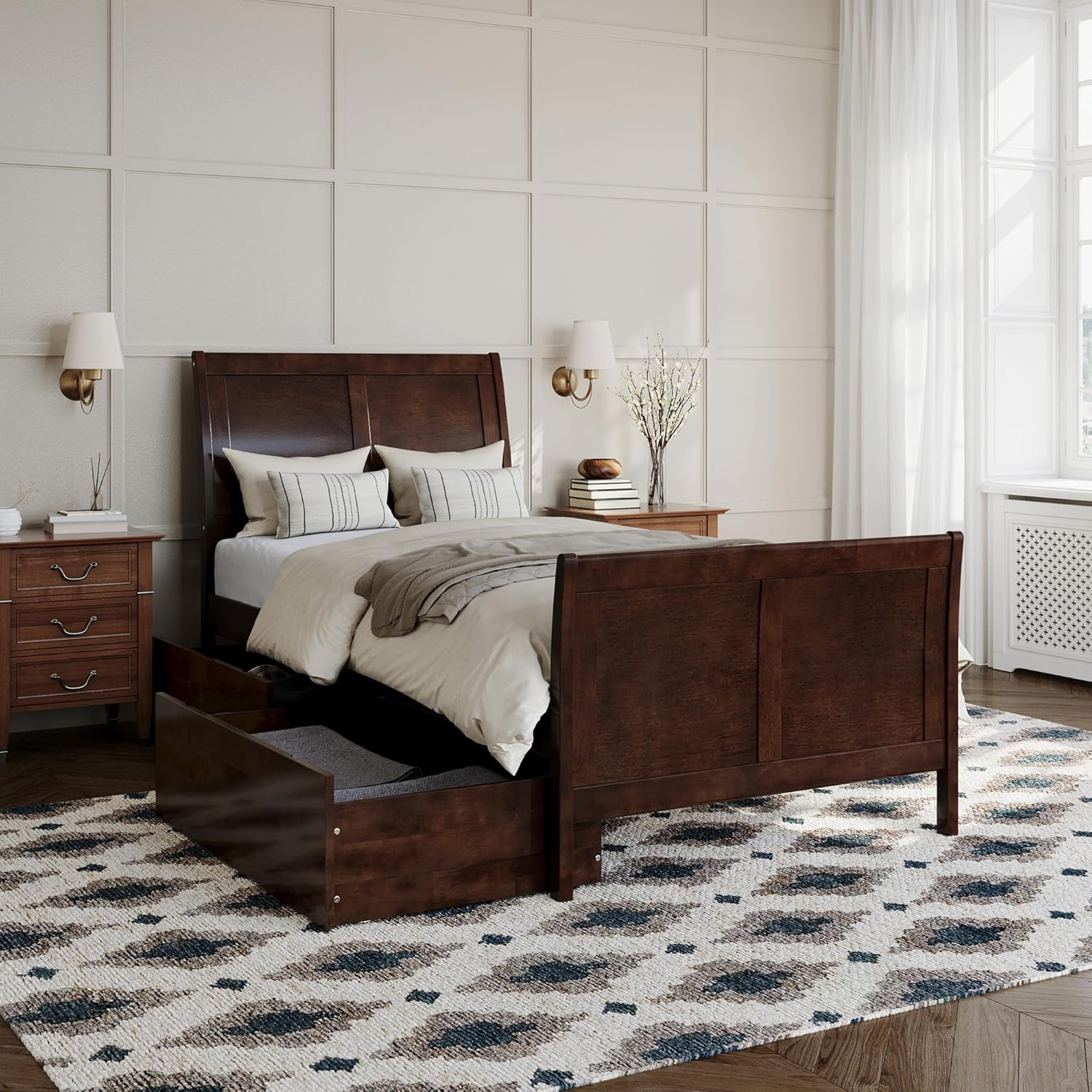 Portland Solid Wood Platform Bed with Matching Footboard and Storage Drawers. Elevate your bedroom with the Portland Solid Wood Platform Bed with Matching Footboard and Storage Drawers, a stunning blend of timeless craftsmanship and modern comfort. Designed to be both beautiful and practical, the Portland transforms your sleep space into a warm and inviting retreat. Featuring a gracefully curved sleigh-style headboard and matching footboard, this bed serves as a striking centerpiece for any room. Choose from rich finishes, including Espresso, White, and Walnut, to perfectly complement your personal style and décor. Built from solid hardwood and durable veneers, the Portland offers lasting quality and support. The included sturdy slat kit eliminates the need for a box spring or foundation, while two spacious storage drawers glide smoothly from beneath the bed to keep your space neat and organized. Available in Twin, Twin XL, Full, Queen, and King sizes, the Portland is designed to fit any room and lifestyle.