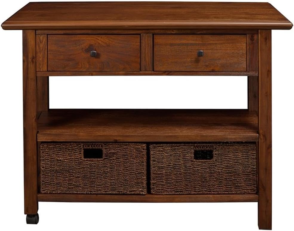 The Caldwell Kitchen Cart provides function in a warm rustic aesthetic. The Antique Cappuccino wire brush finish works well in many environments. Features include felt lined drawers, drop down leaf, storage baskets, and easy rolling castors. With a ton of surface space, this piece is perfect for entertaining or serving.Features:- Antique Cappuccino (Brown) Finish- Crafted with Acacia Solids & Veneer- Easy Rolling Castors- Felt Lined Drawers- Includes Two Storage Baskets- Drop Down LeafSpecifications:- Product Dimensions: 36" H x 28" W x 48" D- Product Weight: 118 lbs- Assembly Required: Yes
