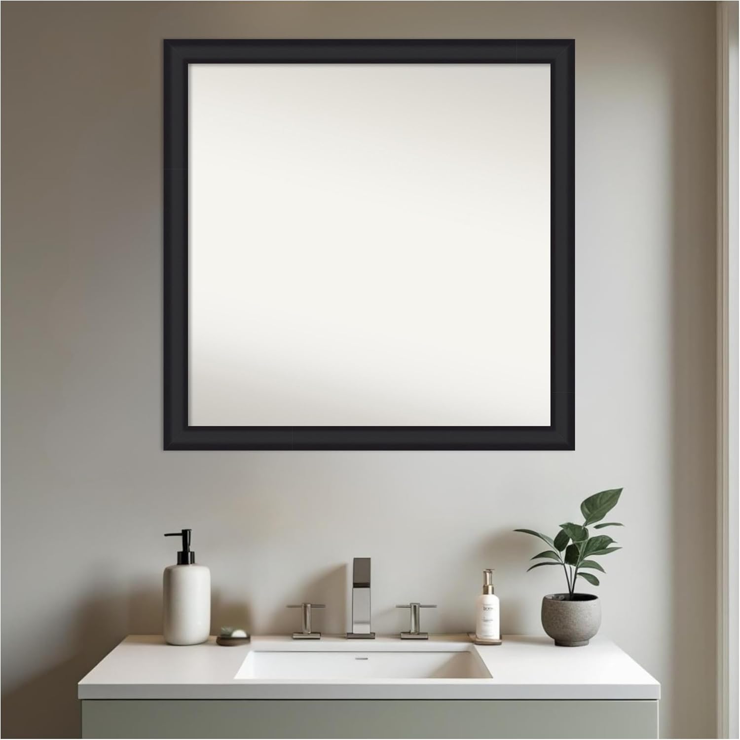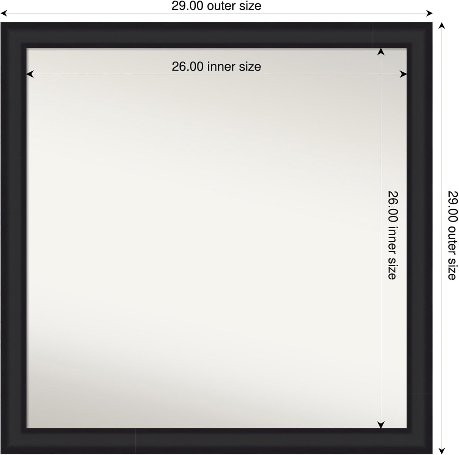 PRODUCT: Amanti Art Non-Beveled Wood Bathroom Wall Mirror; OUTER SIZE: Exactly 29 x 29 inches; FRAME: Oliver Black Narrow; FRAME FINISH: Satin; FRAME COLOR: Black. The Oliver Black Narrow frame is a contemporary, narrow black frame with a satin finish and a gentle scoop. Give your bathroom the finishing touch with this 100% real wood-framed wall mirror. Individually made using traditional custom framing techniques, it has the quality you would expect from your local frame shop. It holds its value with premium finishing that can be appreciated up close. Because of our attention to detail and focus on artistry, architects, interior designers, and homeowners alike choose this mirror to create beautiful living spaces.
