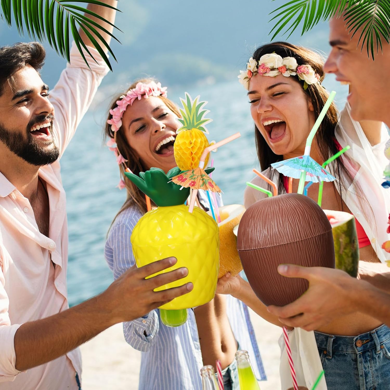 | Color | pineapple cups: pink, yellow, orange, green, blue; coconut cups: brown, white, pink, yellow, blue; cocktail drink picks: as shown in the pictures; umbrella straws: assorted colors |