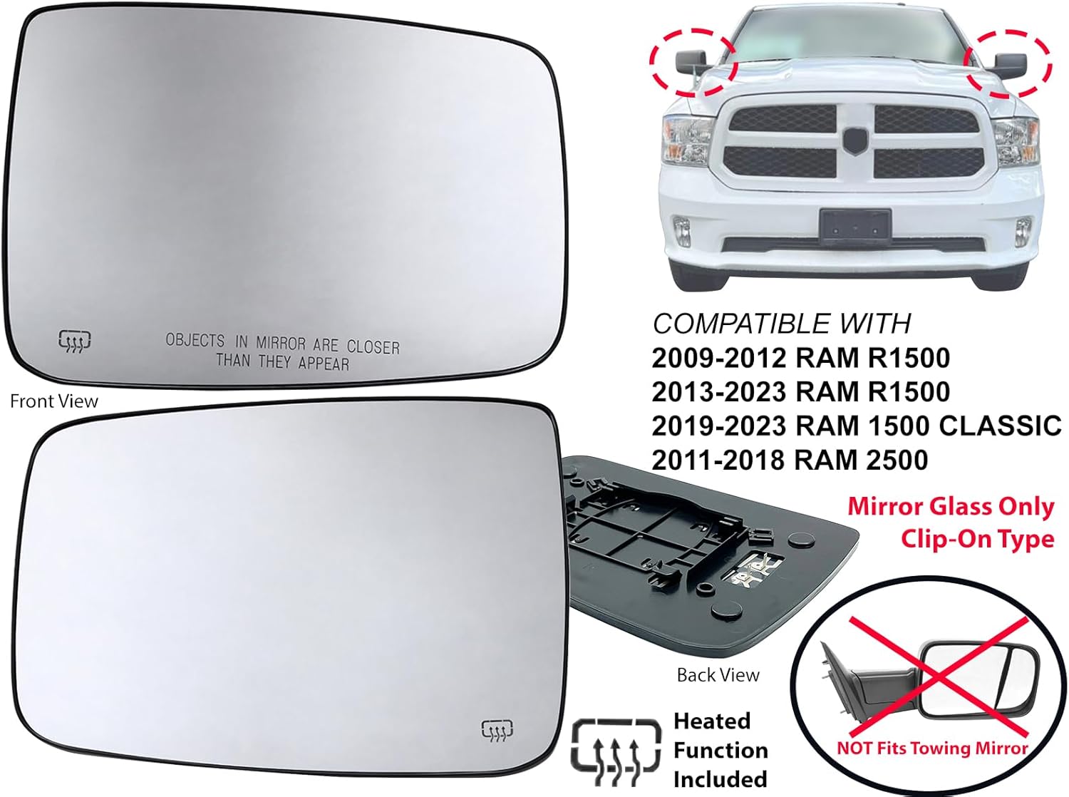 Item Description: Aftermarket Replacement Exterior Rear View Mirror Glass with Backing Plate Pair with Passenger Right RH Side and Driver Left LH Side Convex and Flat Glass Power Adjustment on Mirror Glass With Heated / Defrost / Defogger Function Included Fits Standard Type , Non-Towing Mirror Only No Turn Signal Function on Glass Included No Blind Spot Detection / BSD / BLIS Function Included No Auto-Dimming / Auto Dimmer / Auto Dim / Electrochromic / Light Sensitivity Function Included No Adhesive Necessary No Hardware Included Made in Taiwan Manufactured in TS16949 / ISO 9001 certified facilities Built to strict quality control standards Fits OEM Part Numbers: 68050298AA , 68050298-AA , 68079362AA , 68079362-AA , 68050299AA , 68050299-AA , 68079363AA , 6807963-AA Fits Partslink Numbers: CH1325117 , CH1325126 , CH1324117 , CH1324126 Installation Instructions is included Easy Installation. Direct Replacement! Fits Model and Year: 2023 2022 2021 2020 2019 2018 2017 2016 2015 2014 2013 2012 2011 23 22 21 20 19 18 17 16 15 14 13 12 11 RAM 1500 / R1500 PICK-UP ( Without Towing Package ) 2023 2022 2021 2020 2019 23 22 21 20 19 RAM 1500 / R1500 CLASSIC PICK-UP ( Without Towing Package ) 2018 2017 2016 2015 2014 2013 2012 2011 18 17 16 15 14 13 12 11 RAM 2500 / R2500 PICK-UP ( Without Towing Package ) 2010 2009 10 09 RAM 1500 / R1500 PICKUP ( Without Towing Package )