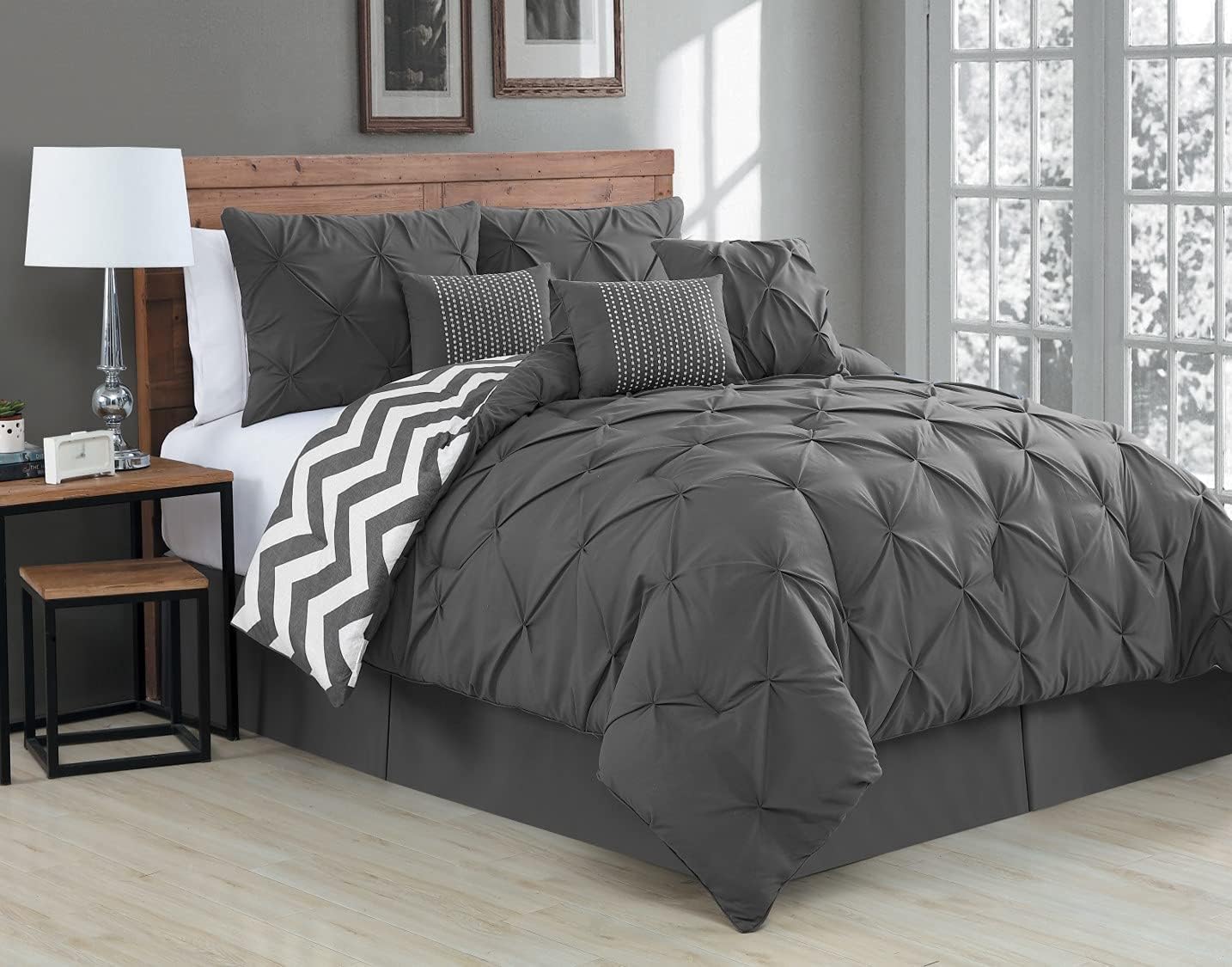 Give your bed a contemporary, luxurious look by showcasing the Ella 7 Piece Comforter Set by Avondale Manor. This beautiful set includes everything you need to elevate the design of your bedroom, including a plush comforter, matching shams, three decorative pillows, and a tailored bed skirt. Change up the look by flipping the comforter over to reveal a high-contrast chevron pattern. This set comes in your choice of available size and color. Made from Microfiber polyester, this set is lightweight and machine washable.