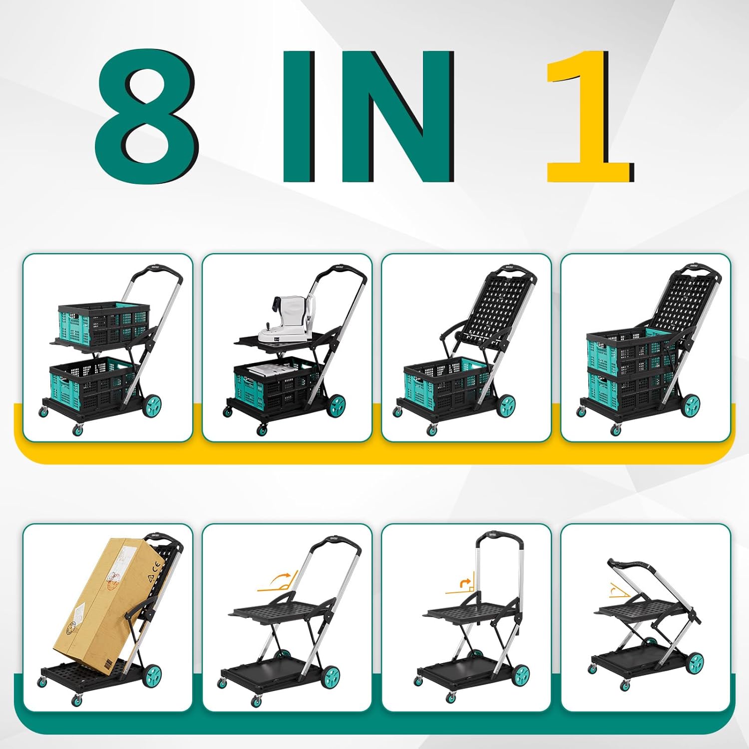 🛒 Looking for a cart that’s sturdy, easy to handle, and saves space when not in use? This 8-in-1 Multi-Functional Folding Utility Cart is designed to keep up with your everyday needs—whether you’re hauling groceries, moving tools, or packing up for a weekend trip. With just one press, you can fold or unfold the collapsible shopping cart with wheels in seconds. Featuring 8 versatile modes and 2 detachable crates, it adapts to items of all shapes and sizes—making your storage and transport flexible and organized. Crafted from lightweight aluminum alloy and reinforced PP panels, this folding utility cart holds up to 200 lbs (90 lbs top, 110 lbs bottom) while remaining easy to lift and store. Hidden foldable metal rods add extra strength without extra weight, so you can rely on it for repeated daily use. Equipped with 3.15" front wheels and larger 7.09" rear wheels covered in quiet TPR material, this folding shopping cart with wheels rolls smoothly across sidewalks, ramps, and uneven terrain. Whether you're climbing slopes or navigating tight spaces, it moves steadily and comfortably. When not in use, it folds down flat to just 4.33" wide—perfect for storing in trunks, closets, or pantries. The dual stackable crates offer more room than standard single-crate designs, letting you carry bulky or oddly shaped items with ease. You’ll receive 1× multi-functional portable utility cart, 2× detachable storage crates, and 1× user manual. Plus, a hidden fastening rope is built into the frame to secure your load without adding clutter. Easy to assemble, easy to rely on—your trusted helper for home, work, or outdoor tasks.