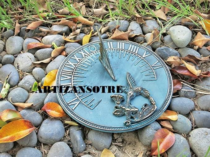 Solid brass Hummingbird sundial highlights. The motto reads, "I am silent without the sun." The ornamentation and fine detailing reflect European gothic design, and a bold, polished gnomon shoots skyward.