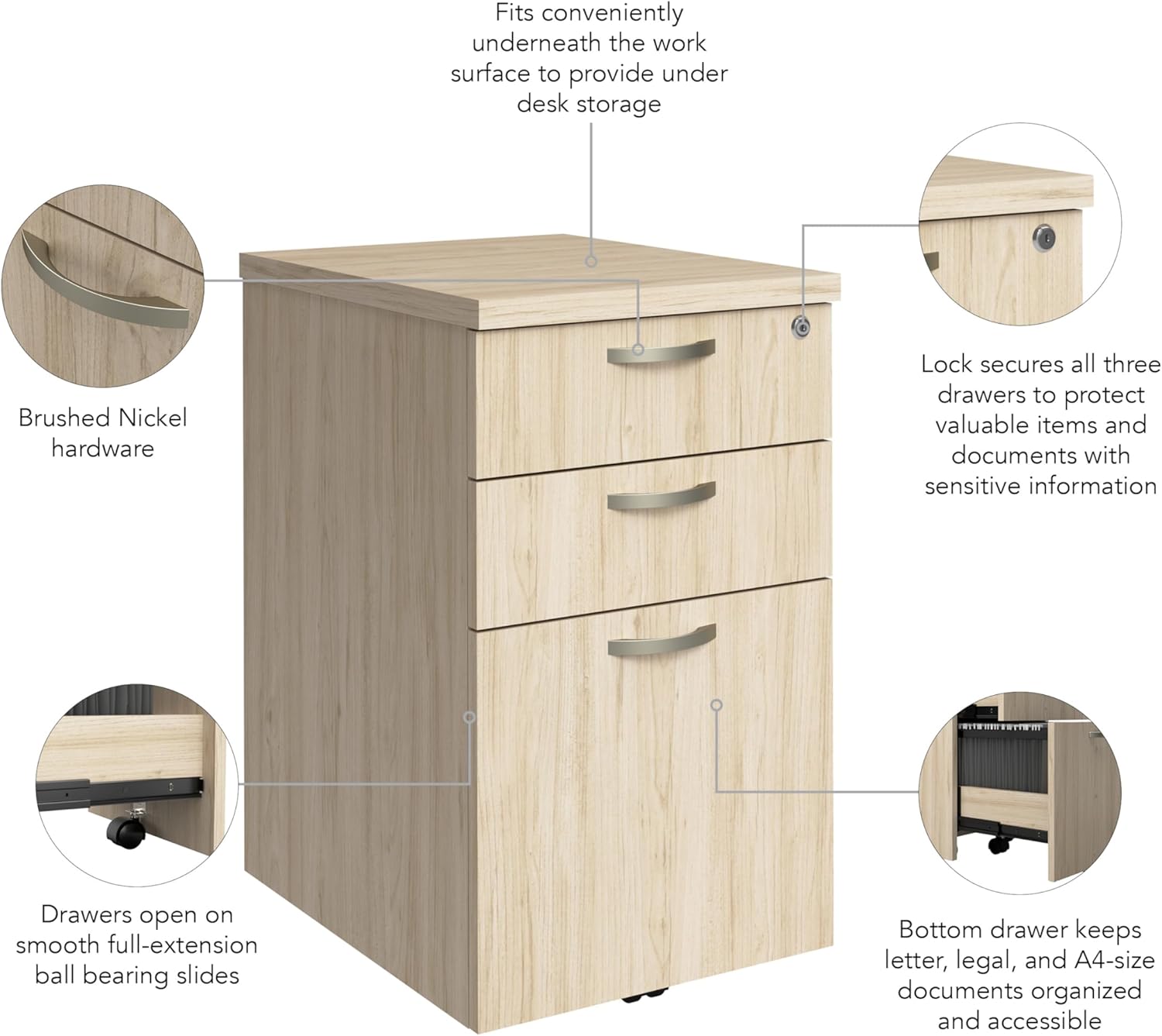 The Office in an Hour 3 Drawer Rolling File CabinetBush Business Furniture's Office in an Hour Collection is an ideal solution for converting empty space into a practical and productive work environment.Designed with convenience in mind, this 3 Drawer Rolling File Cabinet arrives fully assembled so you can enjoy an organized workspace without the hassle and stress of installation.The bottom drawer holds letter, legal, and A4-size files while two box drawers are perfect for stashing office supplies, writing utensils, and personal items. All three drawers lock to protect your valuables and documents with sensitive information.Four dual-wheeled casters move the portable filing cabinet wherever organization is needed most, including beneath the work surface to provide under desk storage capacity.