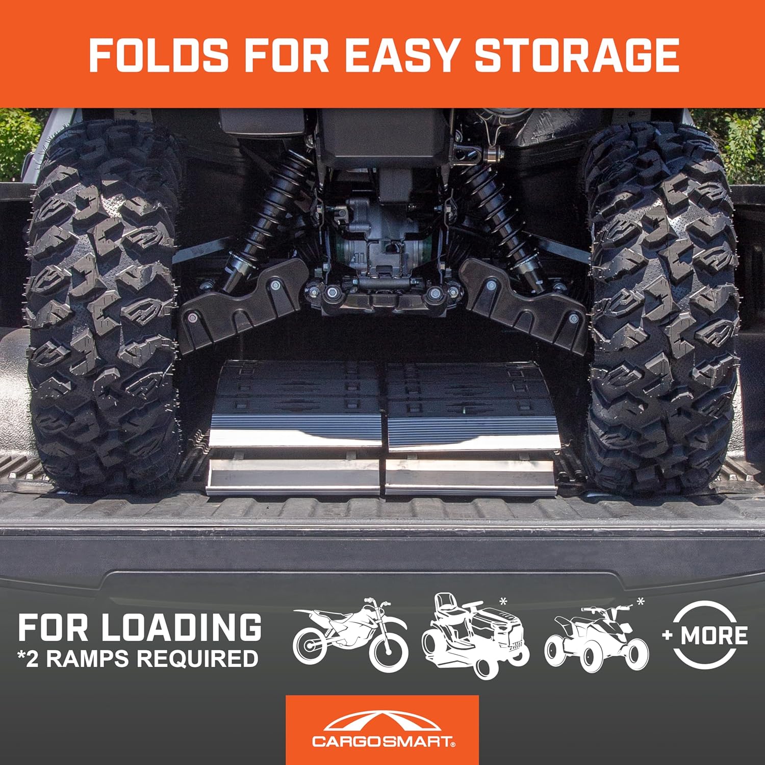 "Safely loading and unloading your cargo and equipment is extremely important, and our hybrid s-curve centerfold ramps offer the best and most efficient way to do so. You can trust these 12” W x 90” L ramps for safely and easily loading and unloading your lawn tractors, push Mowers, garden tillers, atvs, appliances and more. The distributed load per ramp capacity is 750 lb. , giving you peace of mind that your equipment is secure. Adjustable safety straps are included, ensuring your equipment stays safe during loading and unloading. In addition to safety, rest assured that Cargo Smart ramps will make the loading and unloading experience quick, easy and stress-free. The S-Curve design on our loading ramps is a patent pending design that provides a smooth continuous high traction tread. It also has an aggressive tread design that provides excellent grip, and have a proprietary construction that combines aluminum and composite to create a super-strong and durable ramp, which means you can be confident in your ability to safely load and unload your equipment time and time again. The dual arch design also eases transition both off the ground as well as into the truck bed. Cargo Smart ramps are the best choice for loading and hauling your most precious equipment safely. Our mission at Cargo Smart is to engineer cargo management solutions to safely and securely get you where you’re going. Our range of bike and sports racks, cargo carriers, ramps, and organizational solutions work as hard as you do – on the job site or on your next outdoor adventure. Cargo Smart products are designed with innovative features that allow you to get the most out of your activities and passions. " Used with Equipment Type: ATV,Riding Mower,Zero Turn Mower