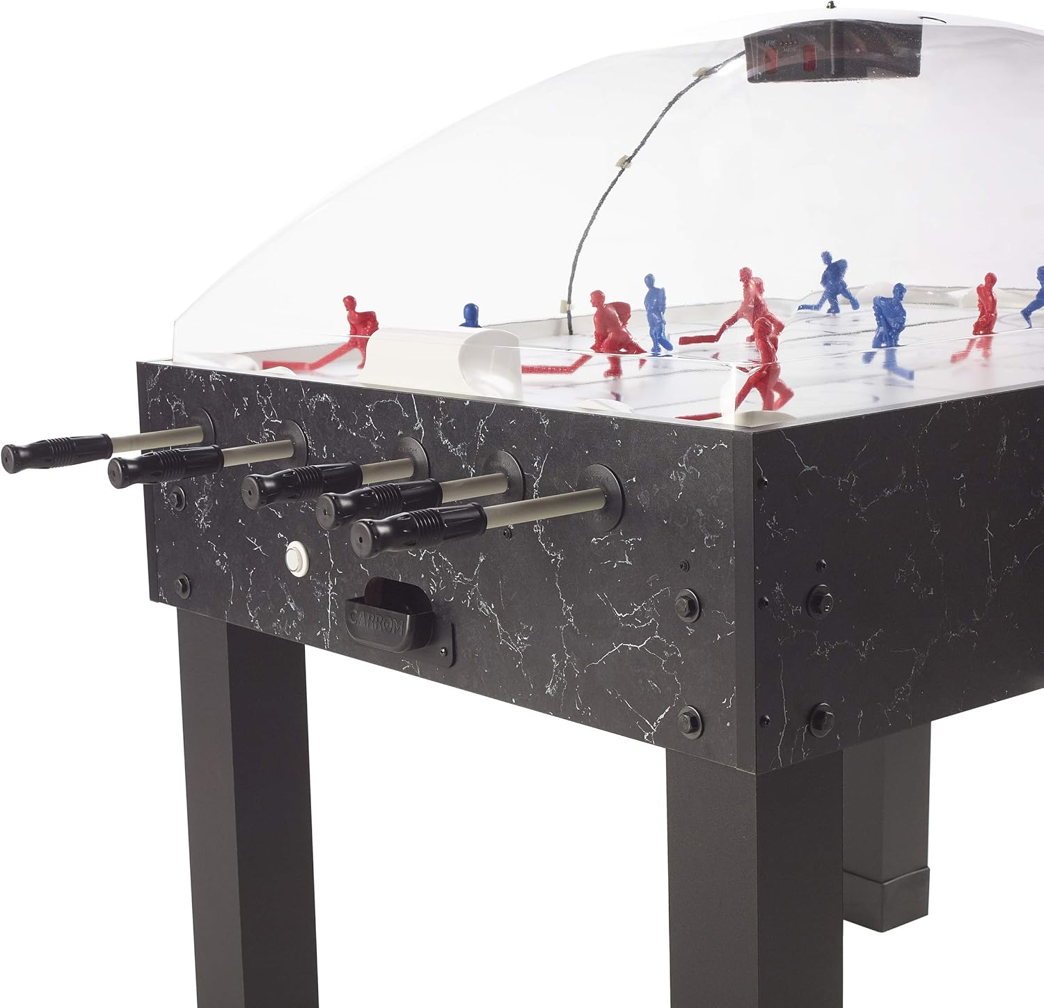 Product Description Feel like you are part of the action! This hockey game puts you in the game with a highly-visible scoring unit that keeps track of periods and goals. This game comes with some seriously tough hardware, almost as tough as real hockey players! Move over hockey cup, it's the Carrom Cup. Exciting score board keeps track of score, game periods and celebrates each goal with light and sound. Reset score anytime with reset button. Automatically shuts down after the end of the third period. Amazon.com Put yourself in the middle of the action with the Carrom Super Stick hockey table. Equipped with a battery-operated scoring unit that celebrates each goal with lights and sound, the table is as close as you'll get to real hockey on a hot mid-summer afternoon. The cabinet is made of thermal-fused, wear-resistant black Melamine, with a shatter-resistant plastic dome over the top and a full-perimeter, extra-thick edge banding around the sides. As a result, the table holds up to heavy use over time. The heavy miter-fold black vinyl legs, meanwhile, include sturdy leg boots for easy and accurate leveling. The real star of the show, however, is the built-in scoring unit, which makes you feel like a real Red Wing or Blackhawk. The unit--which shuts off automatically after two to three minutes of non-use--helps preserve battery power. The stick hockey table comes with two sets of solid-color, hand-painted players and two pucks. Features:Playfield is supported to ensure level playing surface Fiberglass rods are factory assembled to the gear mechanism Gears are precision injection molded for long wear Internal slip clutch in the gears prevent binding and shearing during aggressive play Not intended for use by children under 13 years old Measures 58 by 47 by 45.25 inches (W x H x D) with rods Weighs 140 pounds