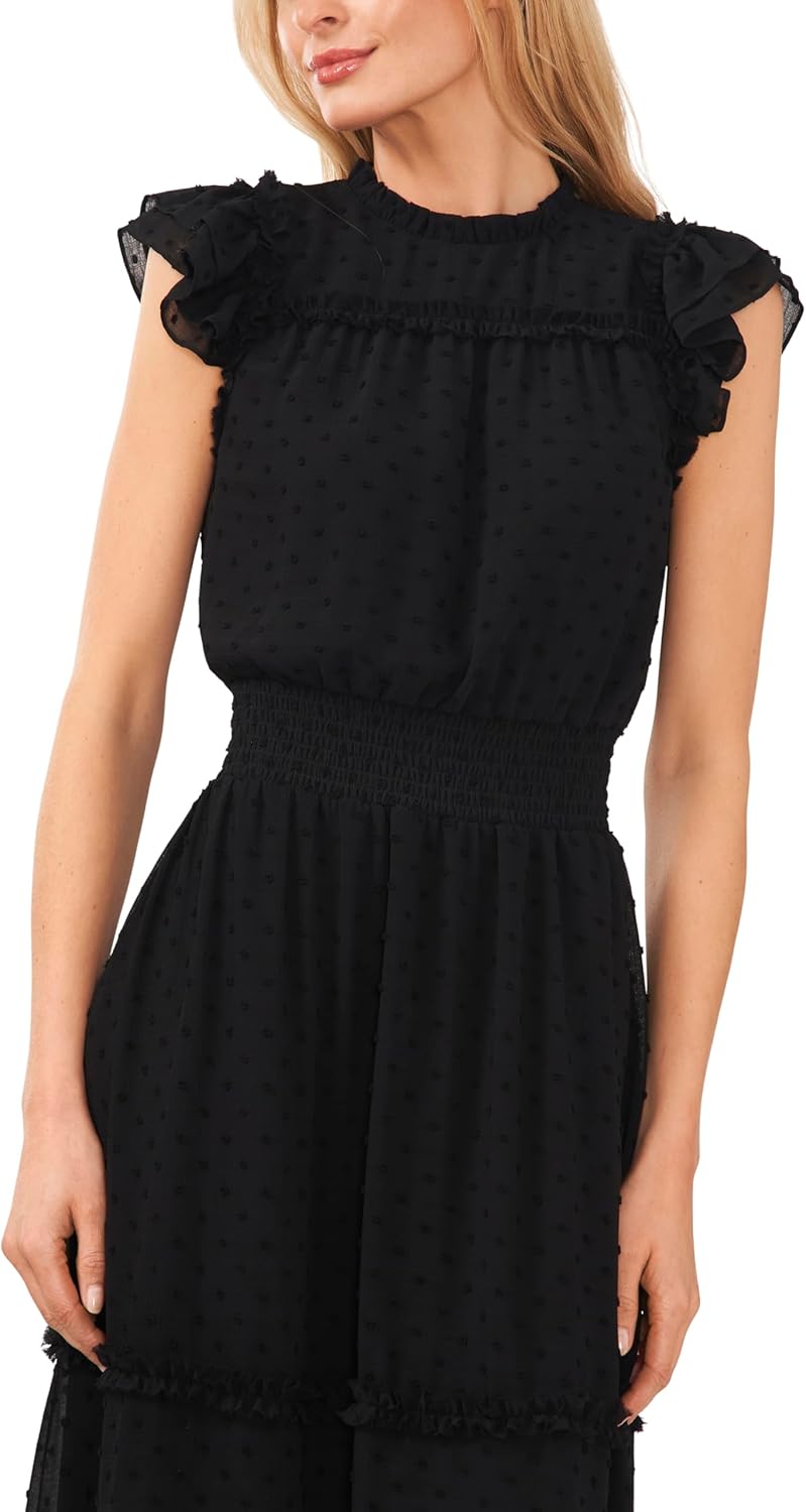 This dress features a delicate clip dot texture that adds a touch of subtle sophistication. The flutter sleeves provide a playful yet graceful silhouette, offering a flattering and breezy fit that moves with you.