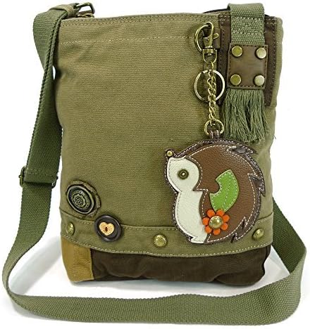 Messenger bag includes the Hedgehog Key Fob! The Crossbody style is so practical. Accented with fabricated flower & fun wood buttons. The Top Zip closure makes it easy to get into. Love the antique brass toned hardware and fully lined interior. One interior zippered pocket Two interior slide pockets Detachable Key Fob / coin purse Material: Washed canvas cotton, leather, & textured faux leather
