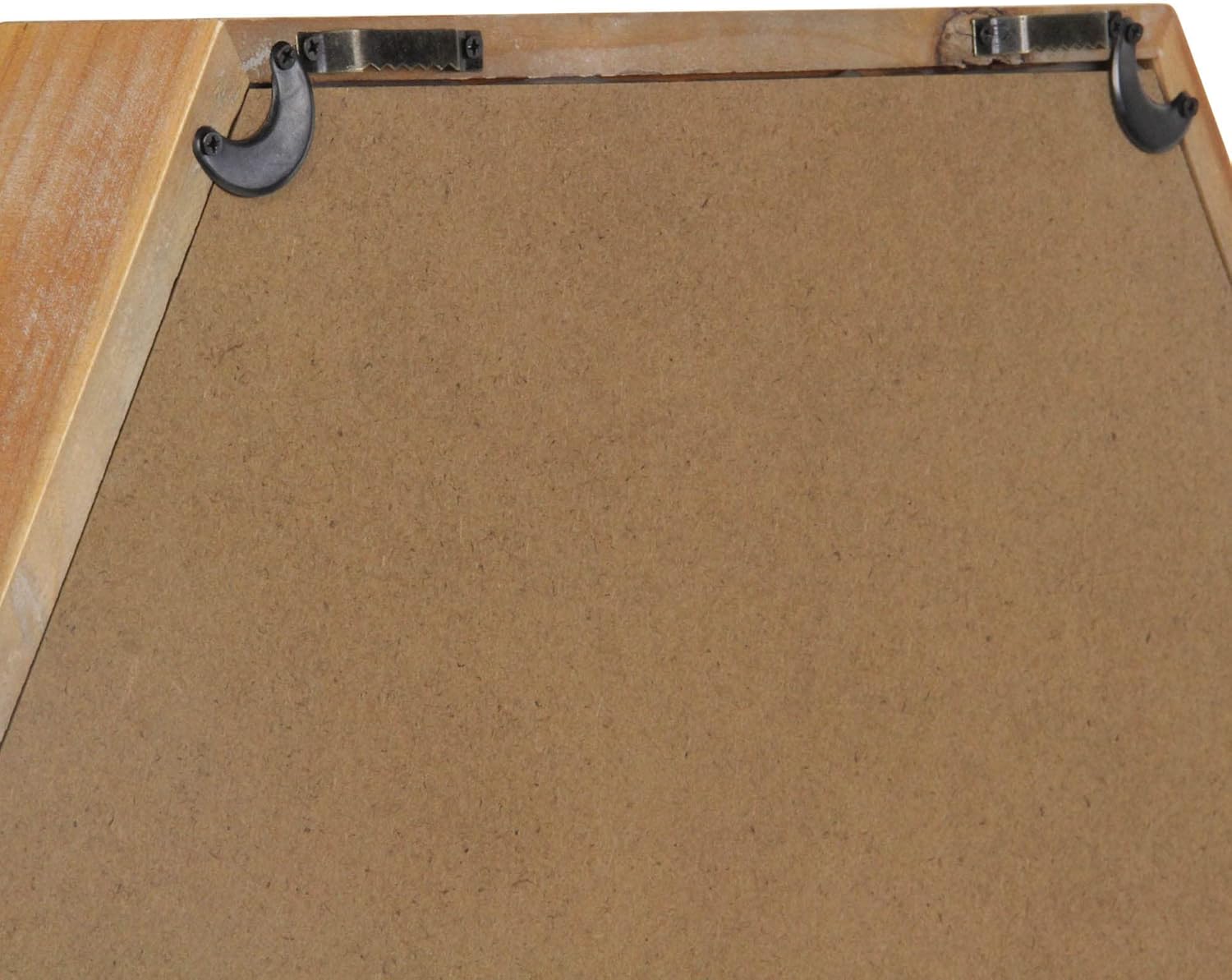 Hexagon mirror with wood frame. Material: Wood, Mirror. Color: Brown. Product Weight: 7.75 lbs. Attached Hanging Hooks. Wood Frame. Hexagon Shape. Distressed: No. Assembly Required: No. Product Dimensions: 23.5"L x 20.5"W x 2.5"H