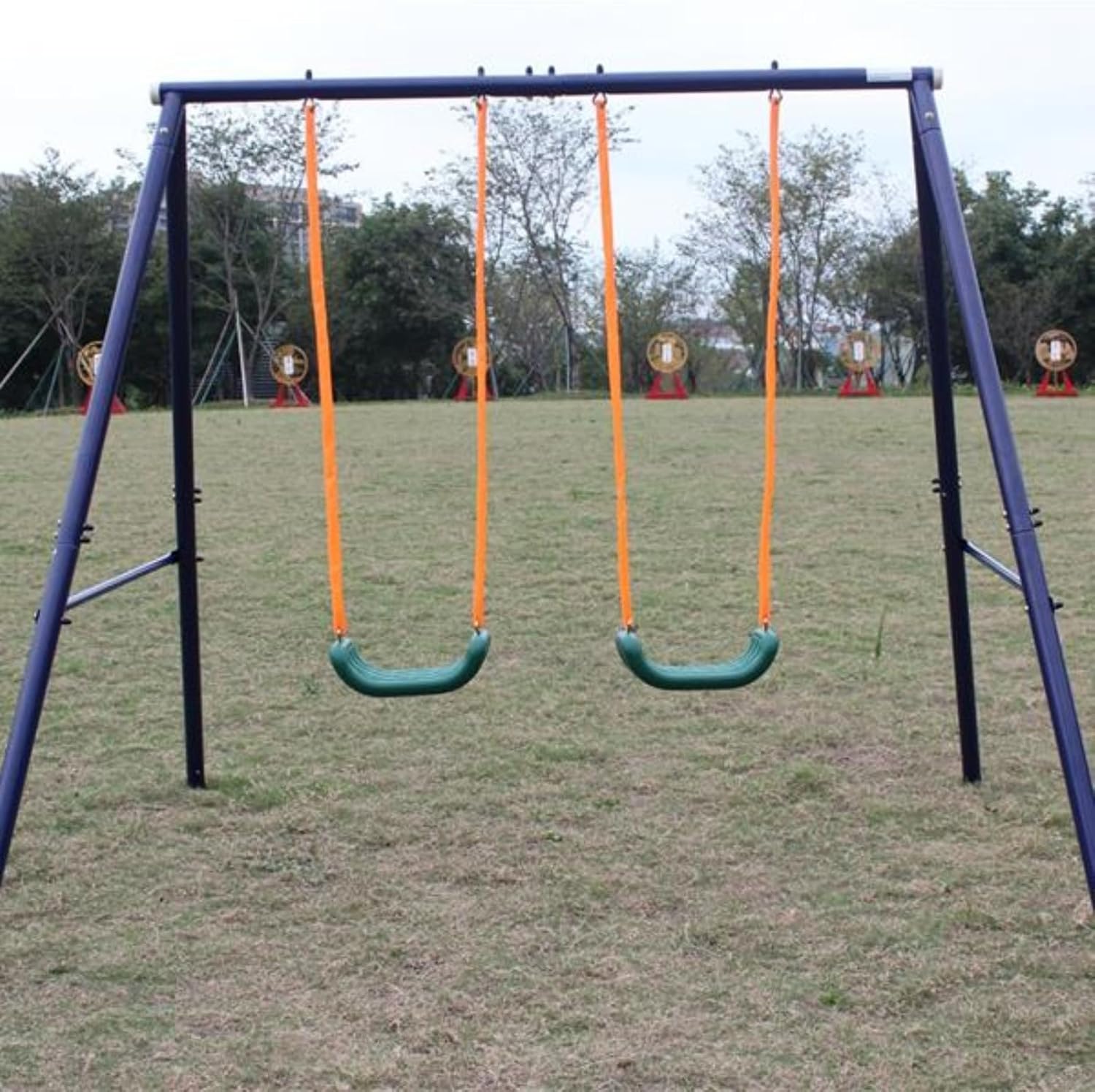 The swing frame is made of heavy-duty steel, and the A-frame creates a sturdy and safe structure. The U-curve design fits the child's body, making it more comfortable and user-friendly. The instructions are simple and easy to understand. The package comes with the necessary tools, and the components are pre-drilled for assembly. Dimensions: 102 inches (W) x 74 inches (D) x 71 inches (H) Net weight/gross weight: 20/21 kg