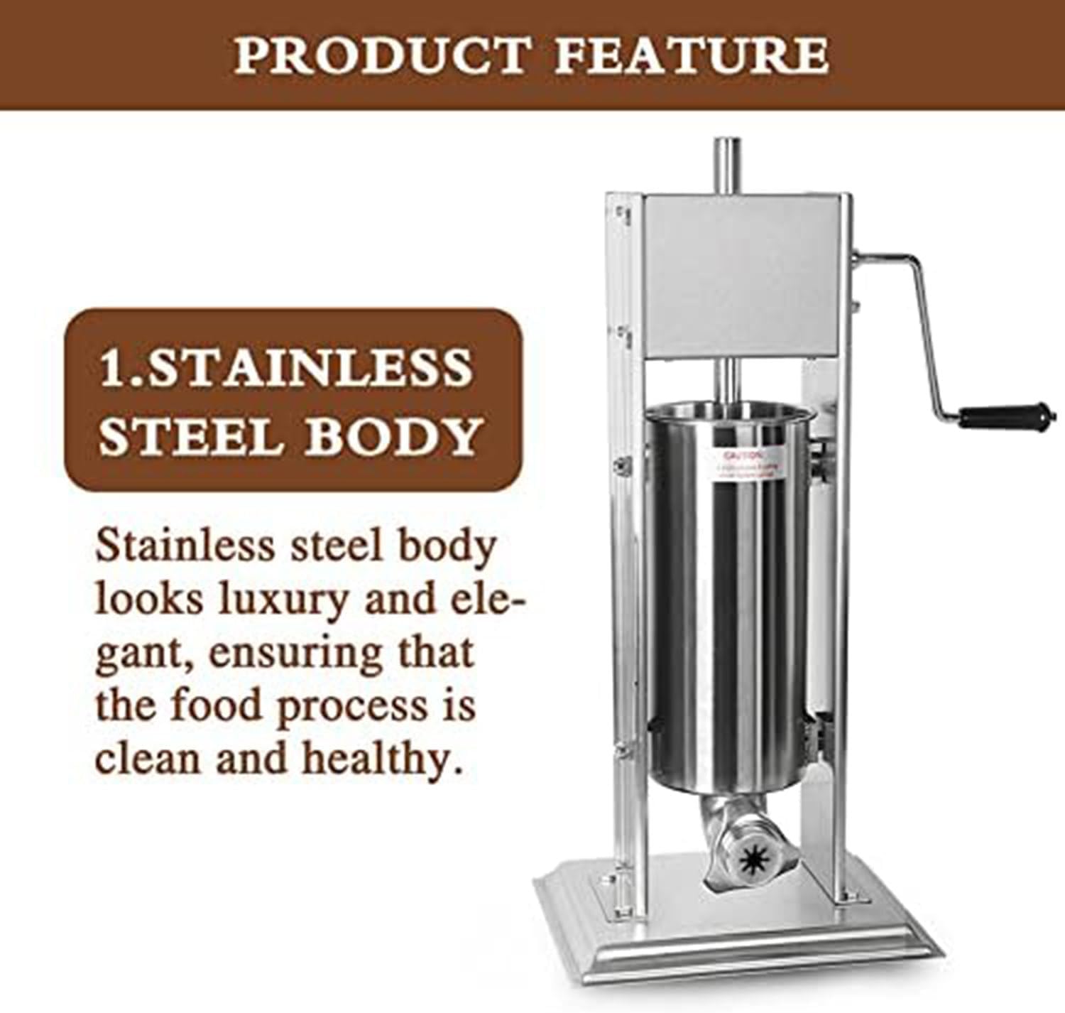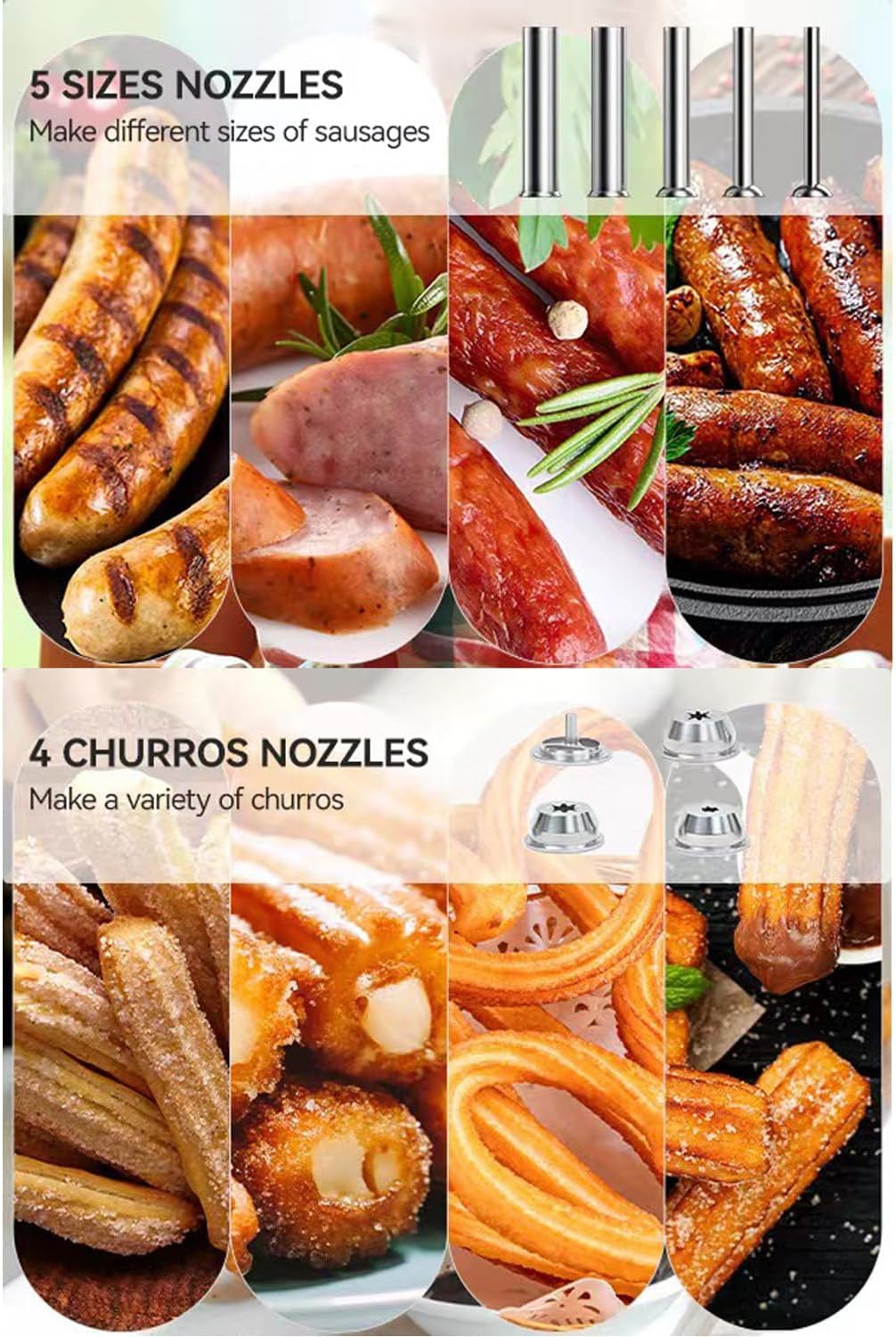 ★Stainless Steel Vertical Sausage Stuffer,2 in 1 Sausage Maker/Spanish Churro Maker ?Do You Like Eating Sausages? But Are You Worried That the Sausages From the Food Stalls Are Not Healthy Enough? ?Then you can try to make delicious and healthy sausages at home with our homemade sausage stuffer. You can control the process of making and customize the flavor you like. ?You can also bring your family together to complete it, making this thing become a traditional activity for the whole family and enhancing family emotions! ?Product parameters: materials: stainless steel Type: manual operation Character: vertical Capacity: 3L/5L/7L weight:9.8kg/10.7kg/12.1kg ?packing list: 1 churro machine 4x nozzles 5x Deepen the enema tube ?If you have any questions before purchasing the product, please contact us by email and we will provide you with a satisfactory answer.