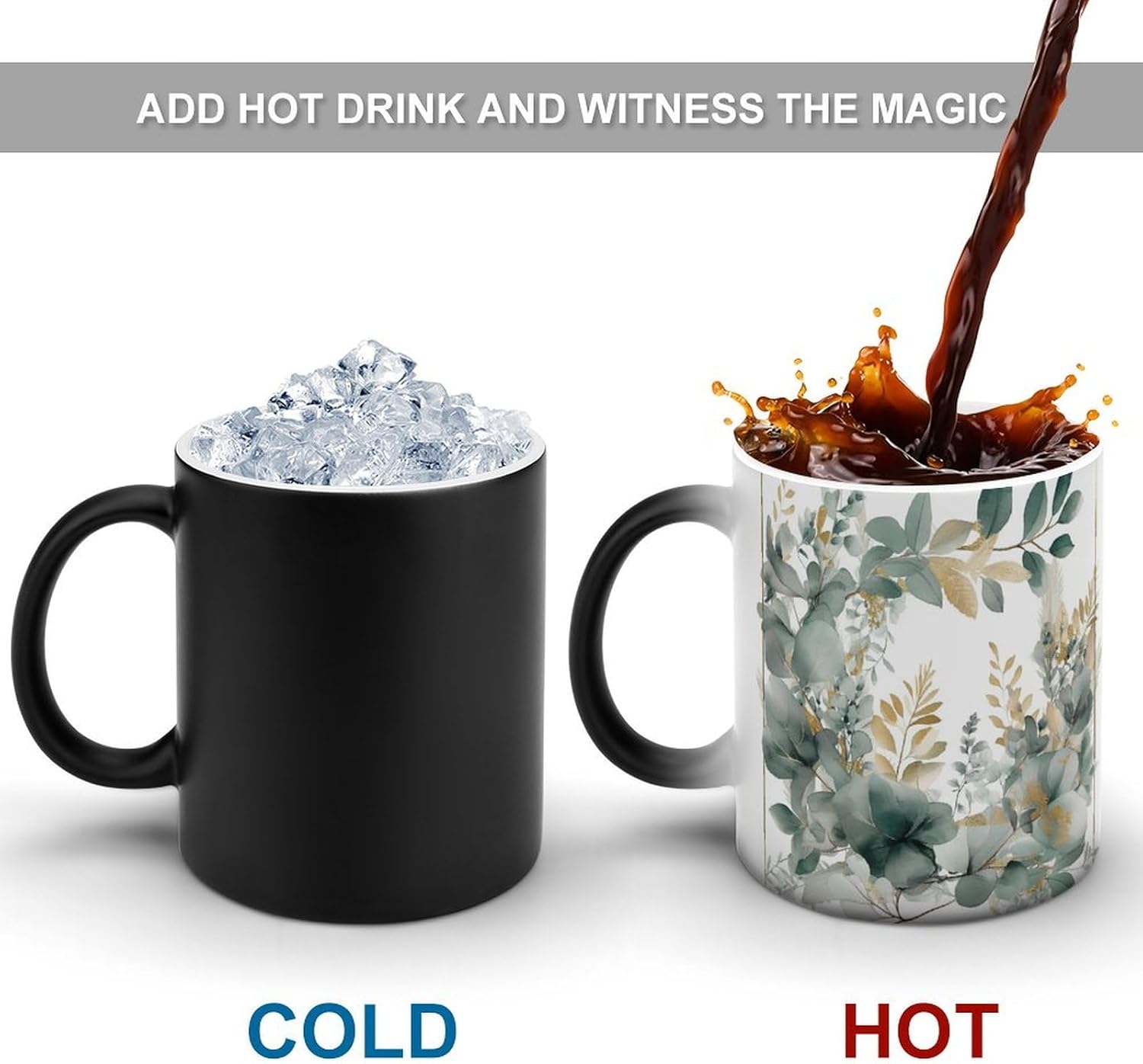 This unique color changing cups is easy to clean, Please scald it with boiling water before using it after receiving it to remove the dust generated during the production process of the cup. It is reusable, Not suitable for dishwashers, only hand wash The Gold And Green Leaves printed reusable color-changing cups are perfect for decorating your kitchen, restaurant or cafe. You can judge whether the coffee is cold by the color of the magic cup, so as to avoid drinking cold coffee