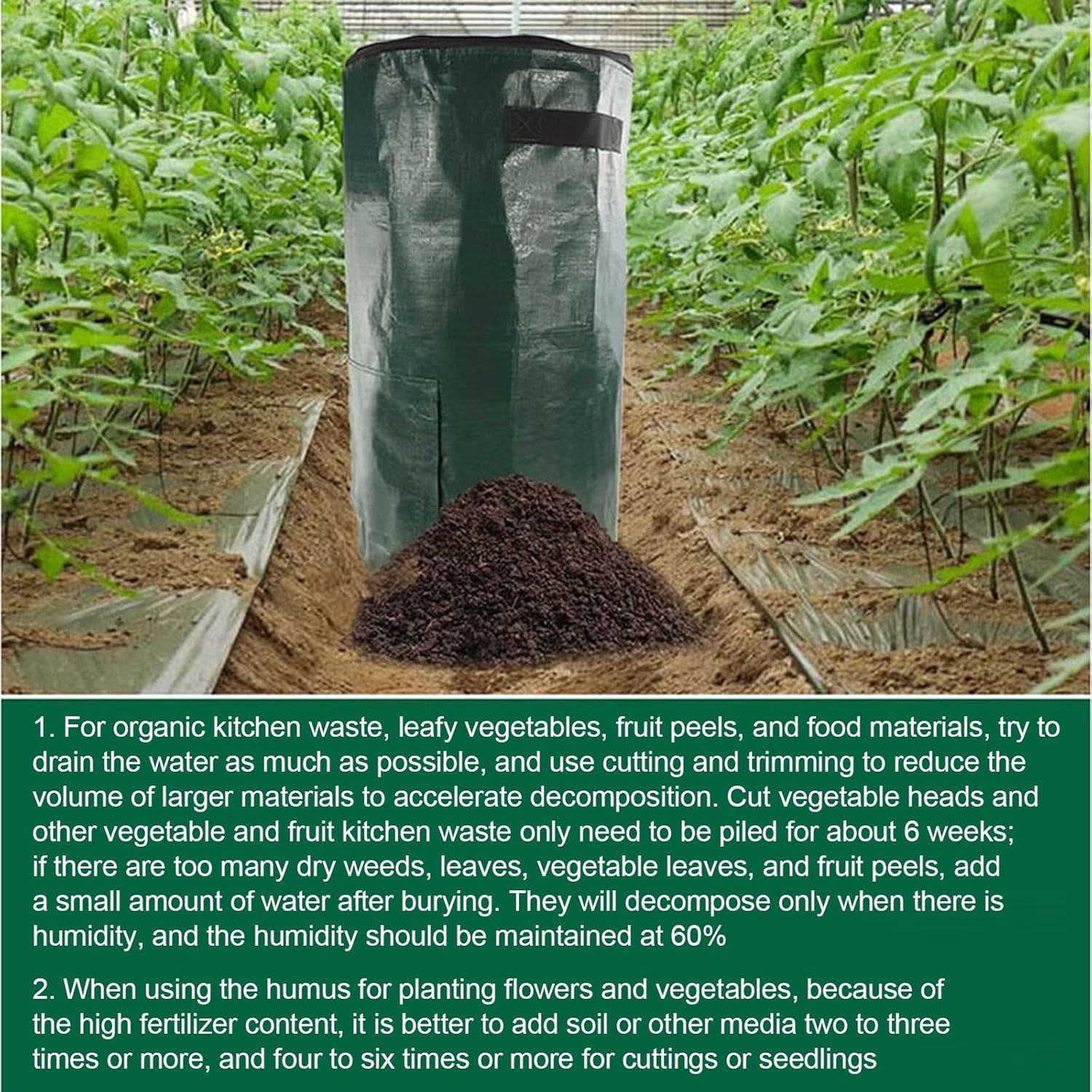 These compost bags are made of high-quality, materials that are reusable. The organic waste inside will be decomposed into fertilizer by the action of sunlight and air. The black/dark green compost bags help to absorb more sunlight, thus increasing the decomposition rate. At the same time, its bottom design allows liquid fertilizer to drain out, effectively maintaining the moisture content inside the compost bag.Product Features:Top Zipper DesignCarry Bag HandleDoor for Manual Fertilizer PickupQuality PE MaterialWaterproof, wear-proof, reusable and washableSize:18 Gallon Bag Size: 35cm / 13.7 inch Bottom Diameter; 60cm / 23.6 inch Deep.34 Gallon Bag Size: 45cm / 17.7 inch Bottom Diamter; 80cm / 31.5 inch Deep.Application:1. Improve the physical and chemicalphysiological state of soil.2. Mix with soil of some proportion, can be used for flowerbed, vegetable garden, lawn, boskage or etc.Package Included:1 x PE Compost BagNote:Due to different product batches, there may be a slight color difference in compost bags from different batches, which is a normal situation.Please check the size before purchasing