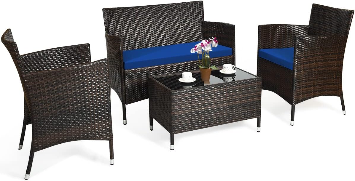 Feature:Made of rattan with good toughness and weather-resistant function Reinforced steel frame with excellent stability Seat cushions for soft and comfortable sitting feeling Coffee table with tempered glass for strong supporting Sectional sofa for rearranging into different combinations Ergonomic backrest and handrail to achieve ultimate relaxation Wide sofa for lying, playing and gathering Non-slip feet to protect your floor from scratch Stylish and elegant design for indoor and outdoor use Ideal for placing in a patio, porch, poolside or garden Easy to clean and maintain with a duster cloth Cushion with zipper for easy cleaning Easy to assemble Specification:Material: Steel + Rattan + Fabric + Sponge Single Sofa Dimension: 23" x 22.5" x 32.5" (L x W x H) Loveseat Dimension: 41" x 23.5" x 32.5" (L x W x H) Coffee Table Dimension: 27.5" x 16" x 16" (L x W x H) Size of Single Sofa Cushion:18.5" x 17.5" x 2"(LXWXH)Size of Bench Cushion:37" x 17.5" x 2"(LXWXH)Net Weight: 57.5 lbs Weight Capacity of Single Sofa: 355 lbs Weight Capacity of Loveseat: 710 lbs Weight Capacity of Coffee Table: 110 lbs Package Includes: 2 x Single Sofa 1 x Loveseat 1 x Coffee Table 3 x Seat Cushion 1 x Instruction