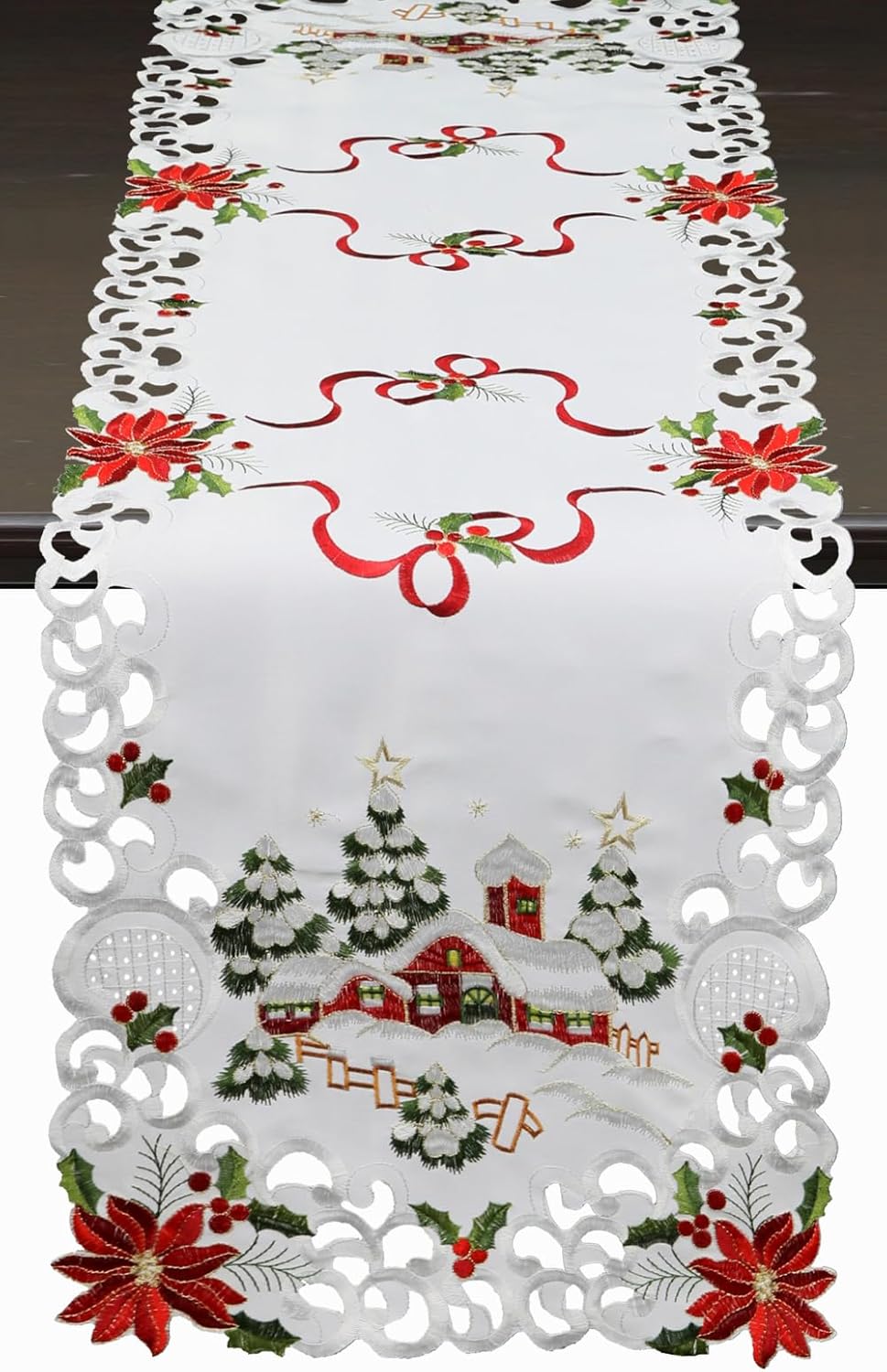This gorgeous Christmas Embroidered Tablecloth has a white background with winter snow scene of embroidered red poinsettia, snowy red cabin and green tree, ribbon, berry, holly, stars scattered along the border and in the center of tablecloth. A lot of the embroidery are outlined with gold thread. It also features cutwork border with embroidered poinsettia. The napkin has an embroidered poinsettia outlined with gold thread at one corner. Imported. 100% polyester. Machine care.