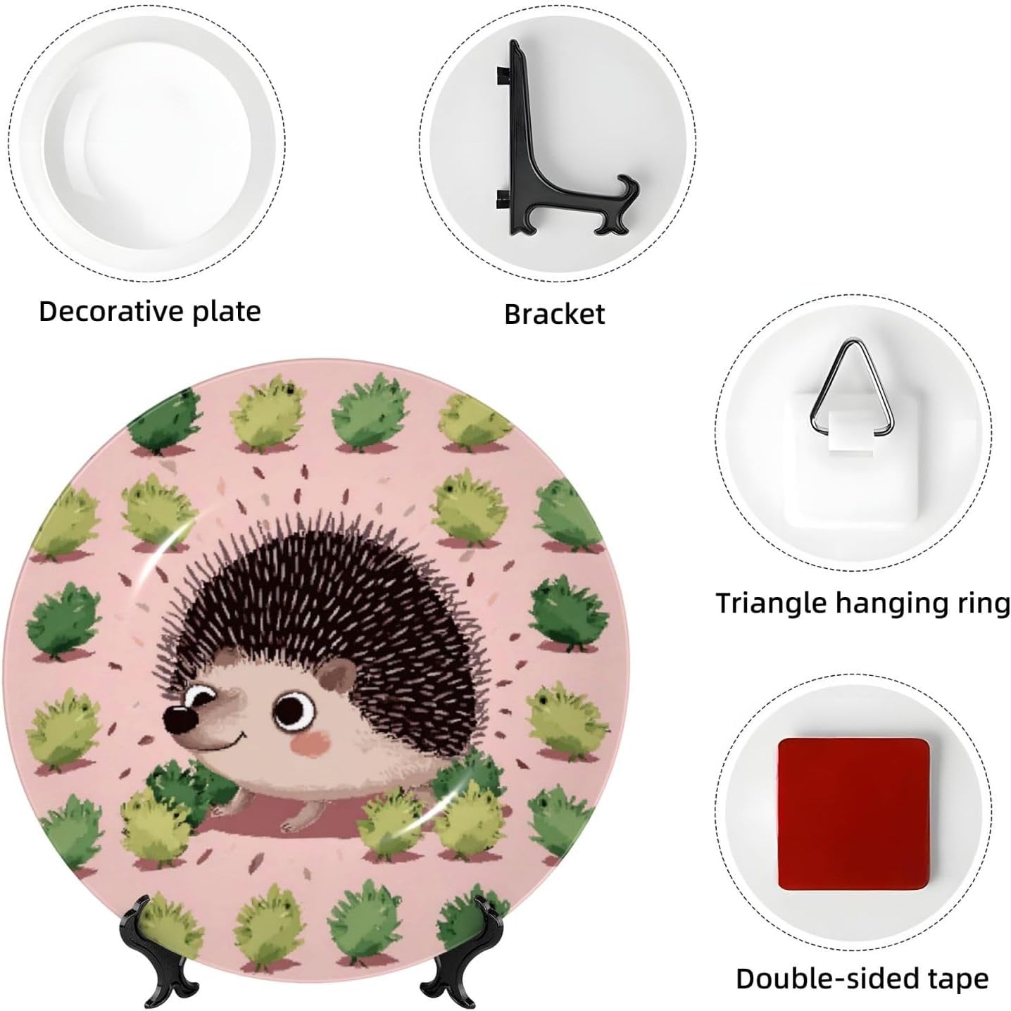 gokays decorative platedo you feel that your table is monotonous? Then use our decorative plate to add a little fun to the monotony of life.featuressize - 6 inch diameter;7 inch diameter;8 inch diameter;10 inch diametermaterial - ceramic design - Cartoon hedgehog package - 1 x ceramic decorative plate, 1 x stand, 1 x pothookwhy choose gokays decorative plates?advantageas manufacturers we follow current trends and bring you the latest home fashion. Salad plates ideal for placement at home or in the office. Traditional porcelain making technology, fine workmanship. Ceramic dinner plates is a good gift for family and friends.convenient to useour dinner plates rack for display has 2 ways to use, you can just place the bracket base on a flat surface first, and then put the plate on it, also you can stick the provided pothook at the back of the plate, and then stick the plate on the wall, you can choose the suitable installation method according to the actual situation.occasionour ceramic ornaments salad plates is a perfect decorative and collection for any niche, table, or mantle at your home. Perfect for your office, home, living room, dining room, playroom, kitchen, cafe, study, studio, club, bar, and others.in a surprise for your family and friends!porcelain dessert plates is a perfect gift for any person in your life. You can give it directly to your lover as mother's day gift/father's day gift/birthday gift/christmas gift/valentines day gift/anniversary gift/wedding gift/housewarming gift/new home gift.start with our funny decorative plate, refresh your rooms!
