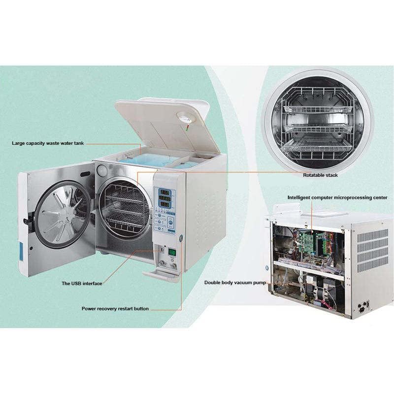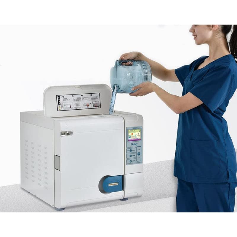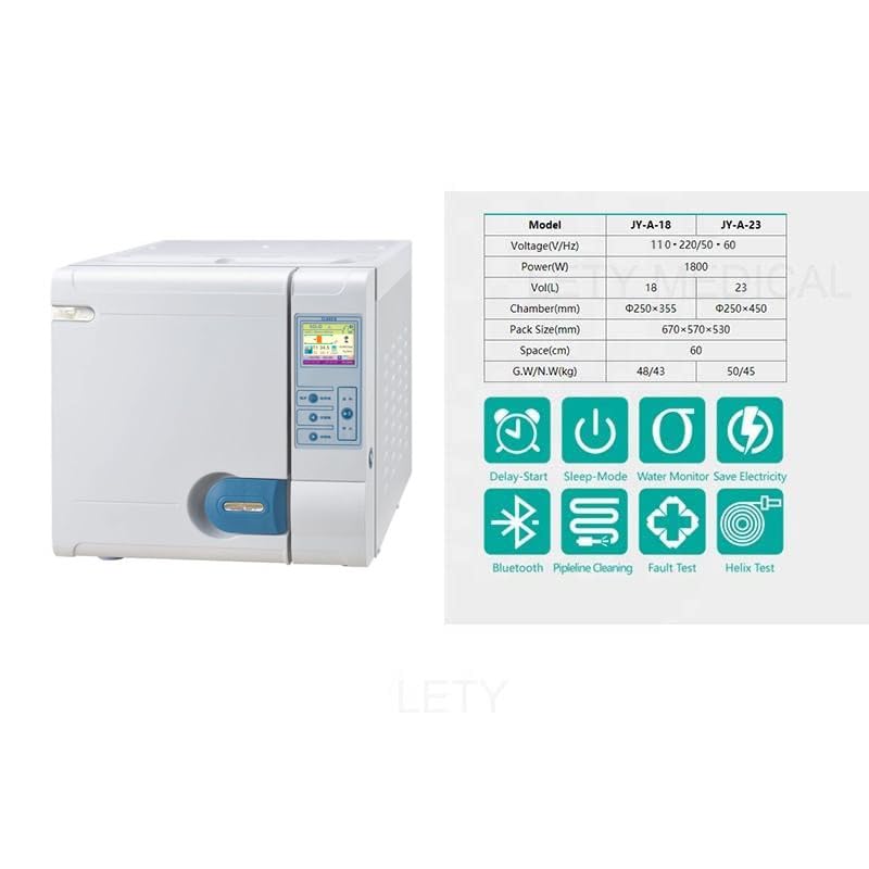 ★Specifications★ Capacity: 6.1 gal (18 L) / 8.1 gal (23Temperature: 288°F (121°C/134°C). Water Tank: Open the water tank on top. Door lock: Dual control Data Logger: USB connection with optional printer Drying Instructions: Vacuum drying Monitor: Flat Panel Monitor, English Test: Bowie & Disk test, vacuum test Recording: Micro printer selectable, U disk connection, all processes are recorded. Safety Features: Decompression valve and computer diagnostic and alarm system Water Supply System: Reservoir (3.5L freshwater reservoir and 5L waste water reservoir) Voltage: 110 V±10% 50/60 Hz Power: 1500 W/10 A Includes: 3 Trays Dimensions: φ9.8 x 17.7 inches (250 x 450 mm) (23 L)/φ9.8 x 14.0 inches (250 x 355 mm) (18 L). Net Weight: 50 Kg