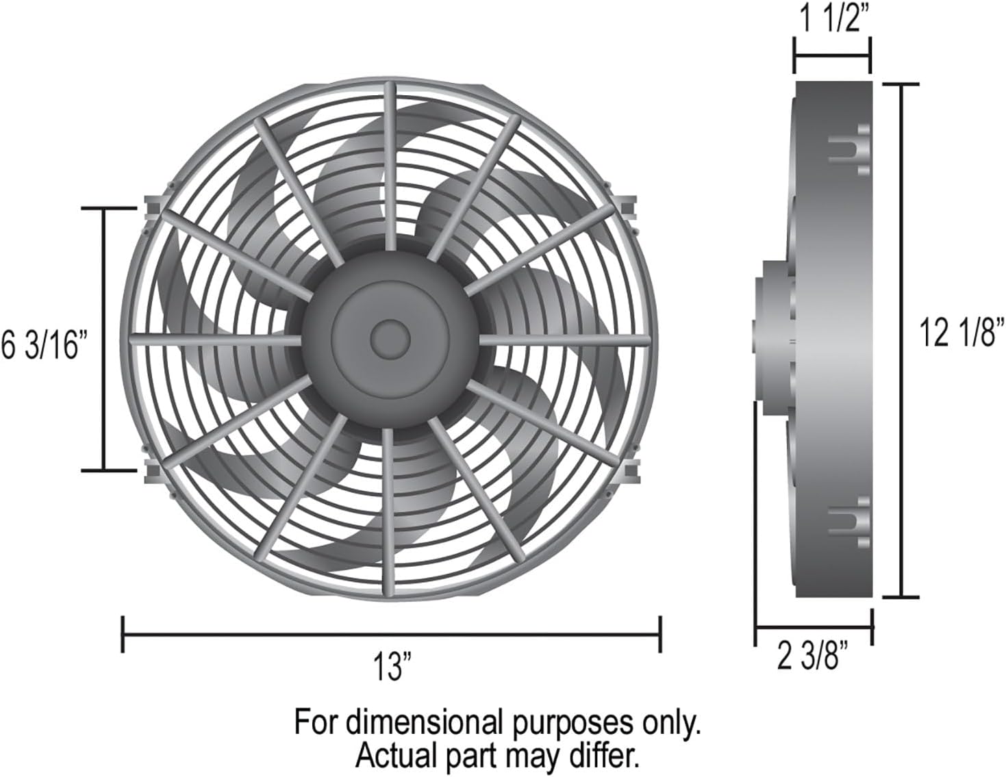 Derale's Dyno Cool 12 inch curved blade electric fan moves 810 CFM at 0 static pressure, drawing only 8.3 amps. Included with every fan is a mounting kit consisting of 4 plastic through radiator core rods and clips, 4 foam pads and 4 mounting feet.