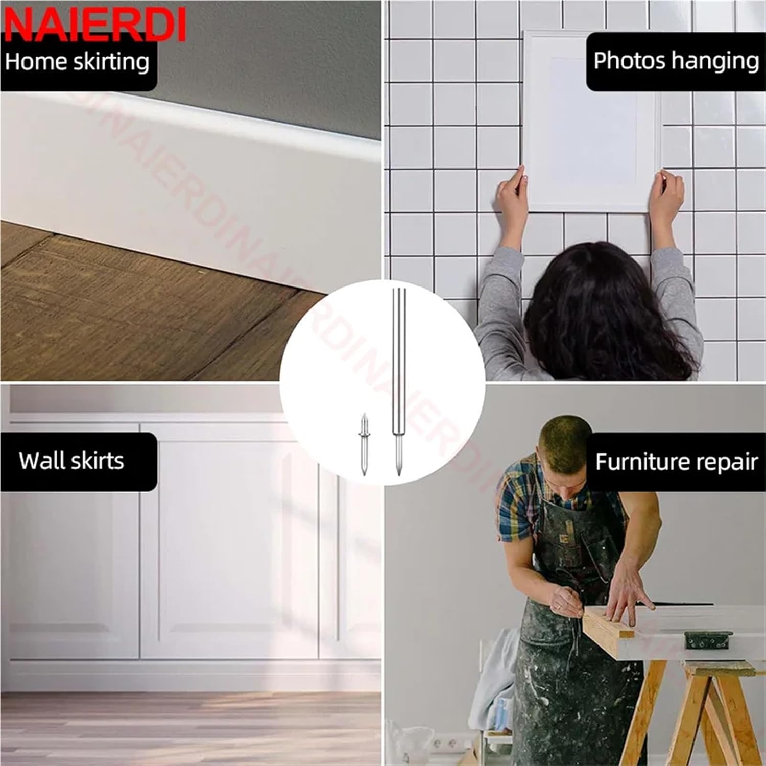 Installation Guidance for Optimal Flush Finish: Drive nails using the included sleeve tool until the head seats just below the material surface; for best results, maintain steady pressure and keep the driving tool aligned straight with the nail shaftMaterial: carbon steelColor: silverSize : as the photo showPackage includes: 300/2500/700 x Nails and one special sleeveNotice:Please allow 1-3mm error due to manual measurement,please make sure you do not mind before you bid.