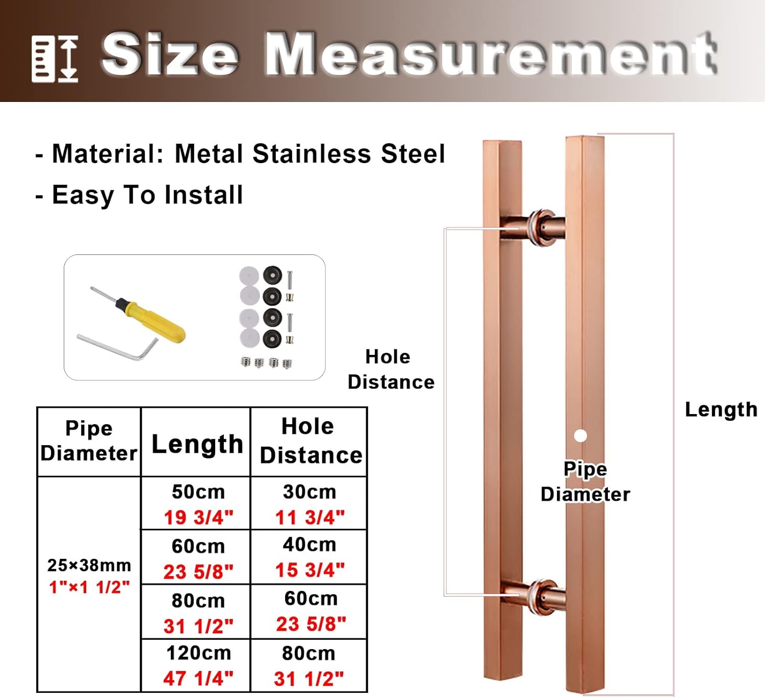 This metal double-sided pipe door pull ideal for use as entry handle, push-pull door handle bar, sliding barn door pull handle, bathroom / shower glass door pulls, classy and sophisticated sense to your whole decoration! 【 Package Includes 】-1 x Pull Handle -1 x Screwdriver -1 x L Hexagon Wrench-2 x Long Screw -4 x Hexagon Socket Screws -4 x Non-slip Silicone Pad-2 x Fixed Sleeve 【 Specification 】- Material: Metal Stainless Steel- Overall Length: 50 cm (20" ), 60 cm (24" ), 80 cm (32" ), 120 cm (48" )- Handle Tube Diameter: 38 mm (1 1/2" )- Color: Rose Gold, Black Titanium 【 Feature 】- Smooth edges for safety.- High-quality stainless-steel material, durable & anti rust.- This handle can be used for left or right-handed applications.- Suitable for both indoor and outdoor hardware applications.- Easy installation, comes complete with accessories and tools.- It can be used on sliding barn door, push-pull door, gate, entrance/entry, wine cellar, shop, shower, kitchen, bathroom, towel bar, shed, garage.- Suitable for different styles of cabinets, wardrobe, drawer, wine cabinet, locker, kitchen cupboard and more.- Perfectly matches with the design in the style of modern, rustic, or industrial. 【 Notice 】- A single purchase of push/ pull handles comes as a PAIR of door pulls for the inside and outside a single door.- For double door applications, 2 pairs are required.- Small errors of 1-2 cm may occur due to different batches and manual measurements. Thank you for your understanding.- All the above images are displayed, and the different display effects may be different. Please refer to the actual product.【 Satisfactory Service 】- We provide with you are the best trusted service. Any questions, please do not hesitate to contact us, we will serve you 24 hours.