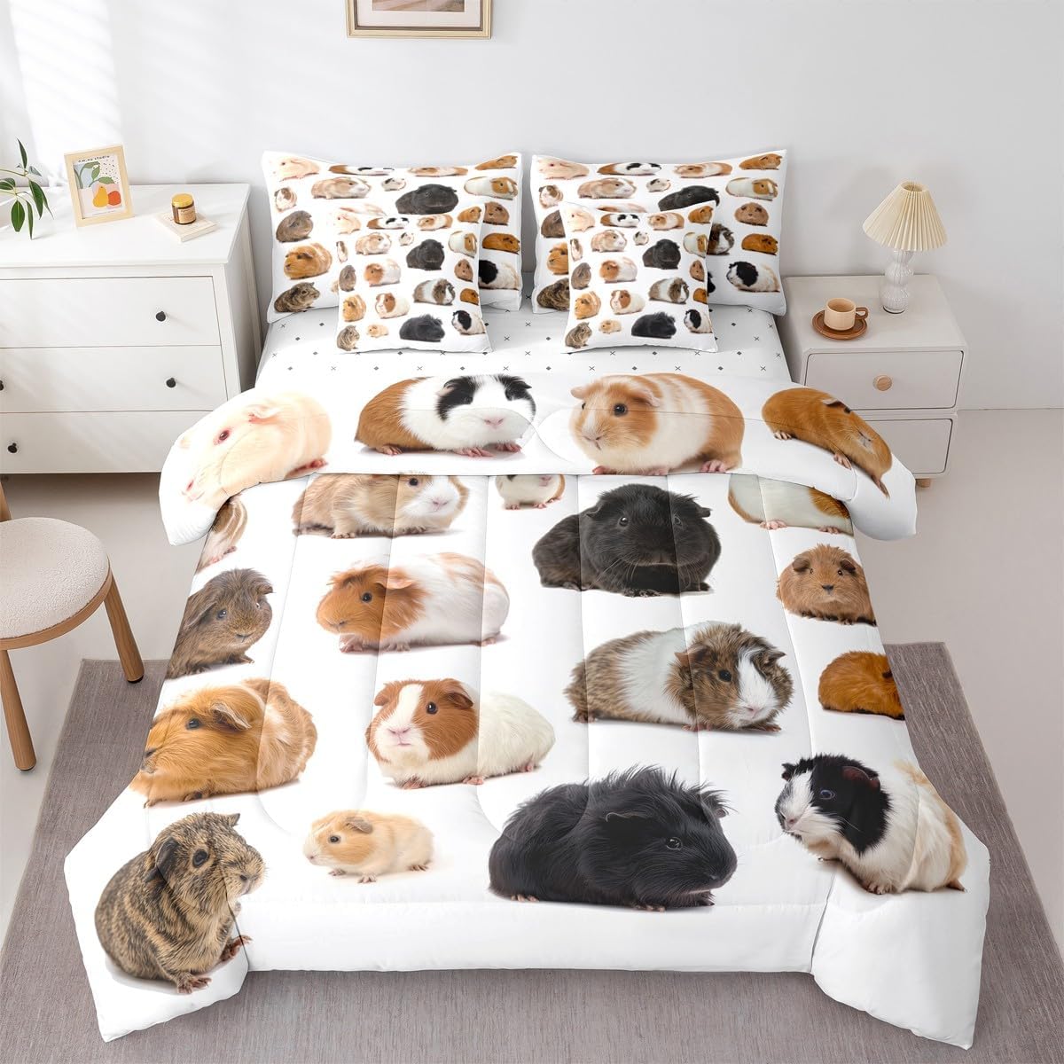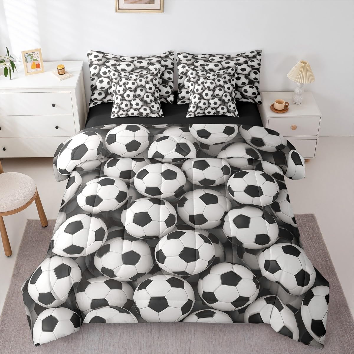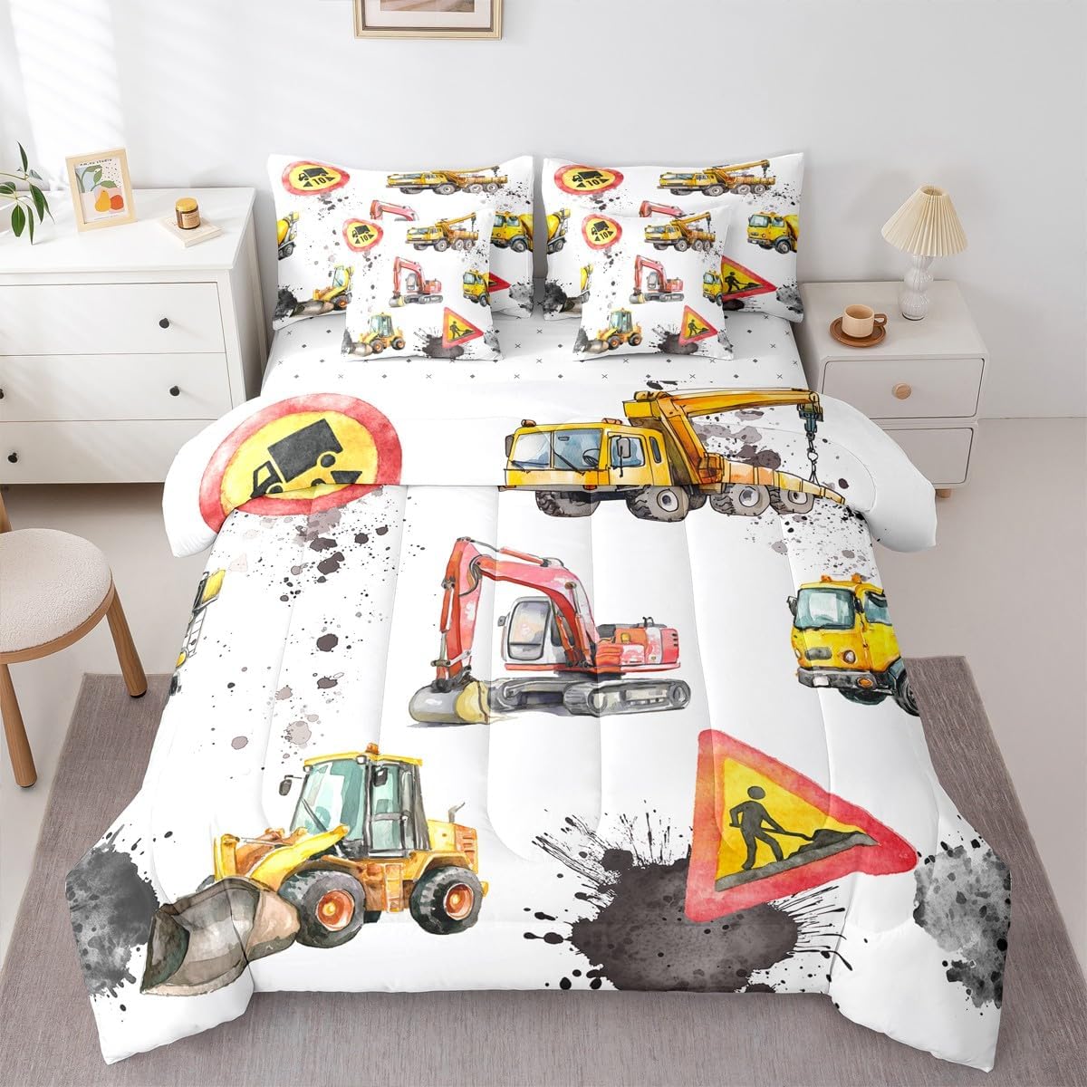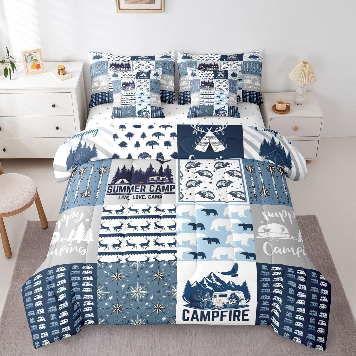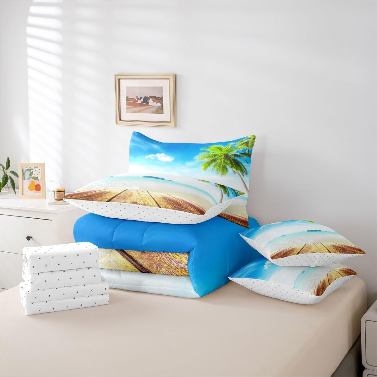 Size Information Twin : 1 Comforter: 68"x90",1x Fitted Sheet 39"x75"x16",1x Flat Sheet 96"x66",2x Pillowcases 20"x30" and 2 Pillow Cover 18"x18" Full : 1 Comforter: 79"x90",1x Fitted Sheet 54"x75"x16",1x Flat Sheet 96"x66",2x Pillowcases 20"x30" and 2 Pillow Cover 18x18" Queen : 1 Comforter: 90"x90",1x Fitted Sheet 60"x80"x16",1x Flat Sheet 102"x90",2x Pillowcases 20"x30" and 2 Pillow Cover 18"x18" King : 1 Comforter: 104"x90",1x Fitted Sheet 78"x80"x16",1x Flat Sheet 106"x90",2x Pillowcases 20"x36" and 2 Pillow Cover 18"x18" Style Variety: Available in multiple styles. Suitable Spaces: For use in bedrooms, guest rooms, living rooms, or RVs. Printing Process: Manufactured using reactive printing and dyeing technology. Design Feature: Diverse pattern options. Care Instructions: Machine washable. Air dry. Low-heat ironing recommended. Not suitable for bleach, dry cleaning, or machine drying. Intended Decor: Designed for home textile applications.