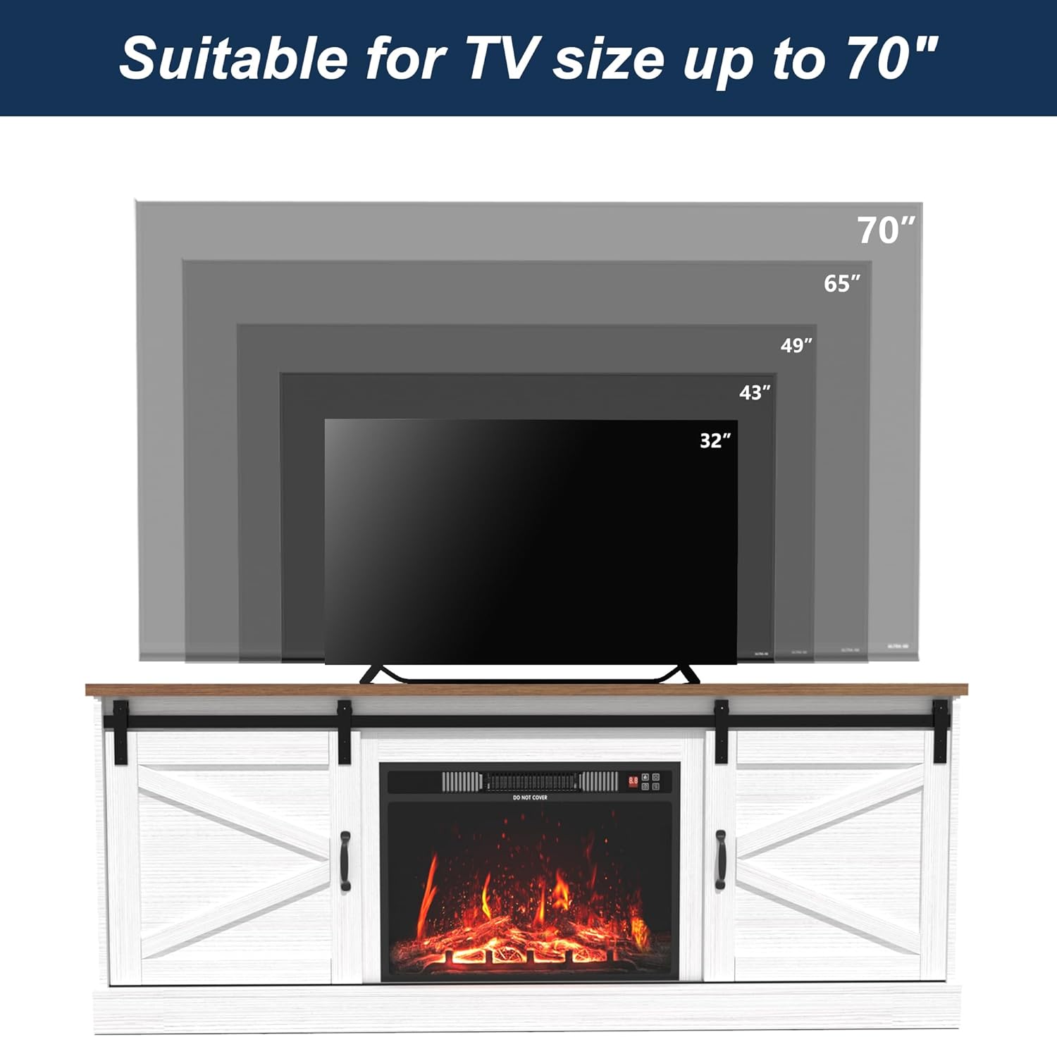 Farmhouse TV Stand with Fireplace for 75" TV, Sliding Barn Door Entertainment Center w/24 Electric Fireplace with Remote Control, TV Cabinet Storage Shelves for Living Room, White