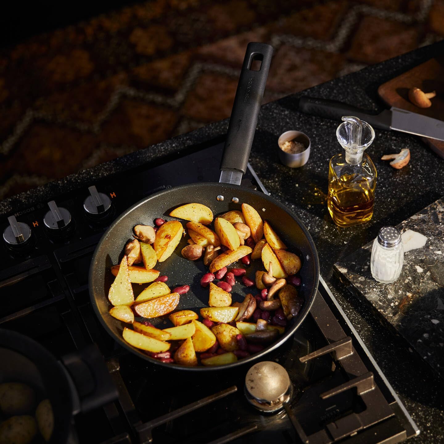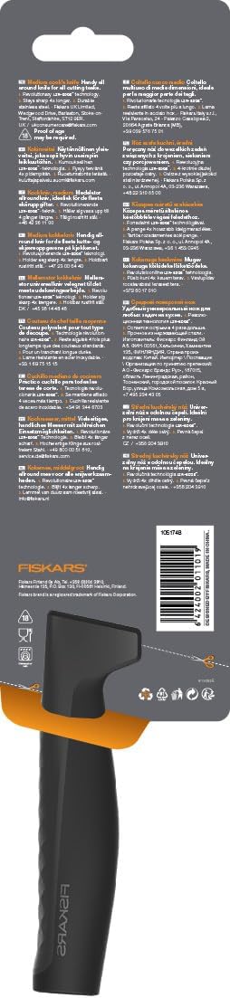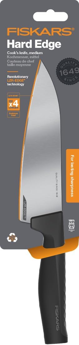 Fiskars Hard Edge knives are designed to ensure lasting sharpness and easy-to-maintain daily performance. The Fiskars Hard Edge Medium Chef's Knife is a sturdy, general-purpose knife that is ideal for a wide variety of cutting and chopping tasks. The blade is made of thick stainless steel withrevolutionary LZR-EDGE™ technology, where carbide is fused to the cutting edge, to increase durability and longevity. This allows the knife to stay sharp up to 4x longer than standard knives without similar technology. The knife handle also features an ergonomic design, with SoftGrip™ and a unique 3D pattern, to ensure the perfect grip. Dishwasher safe. Designed in Finland.