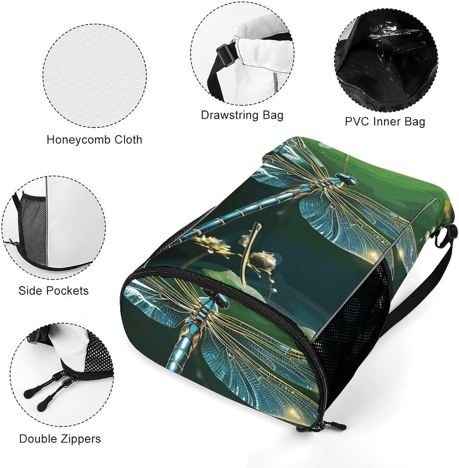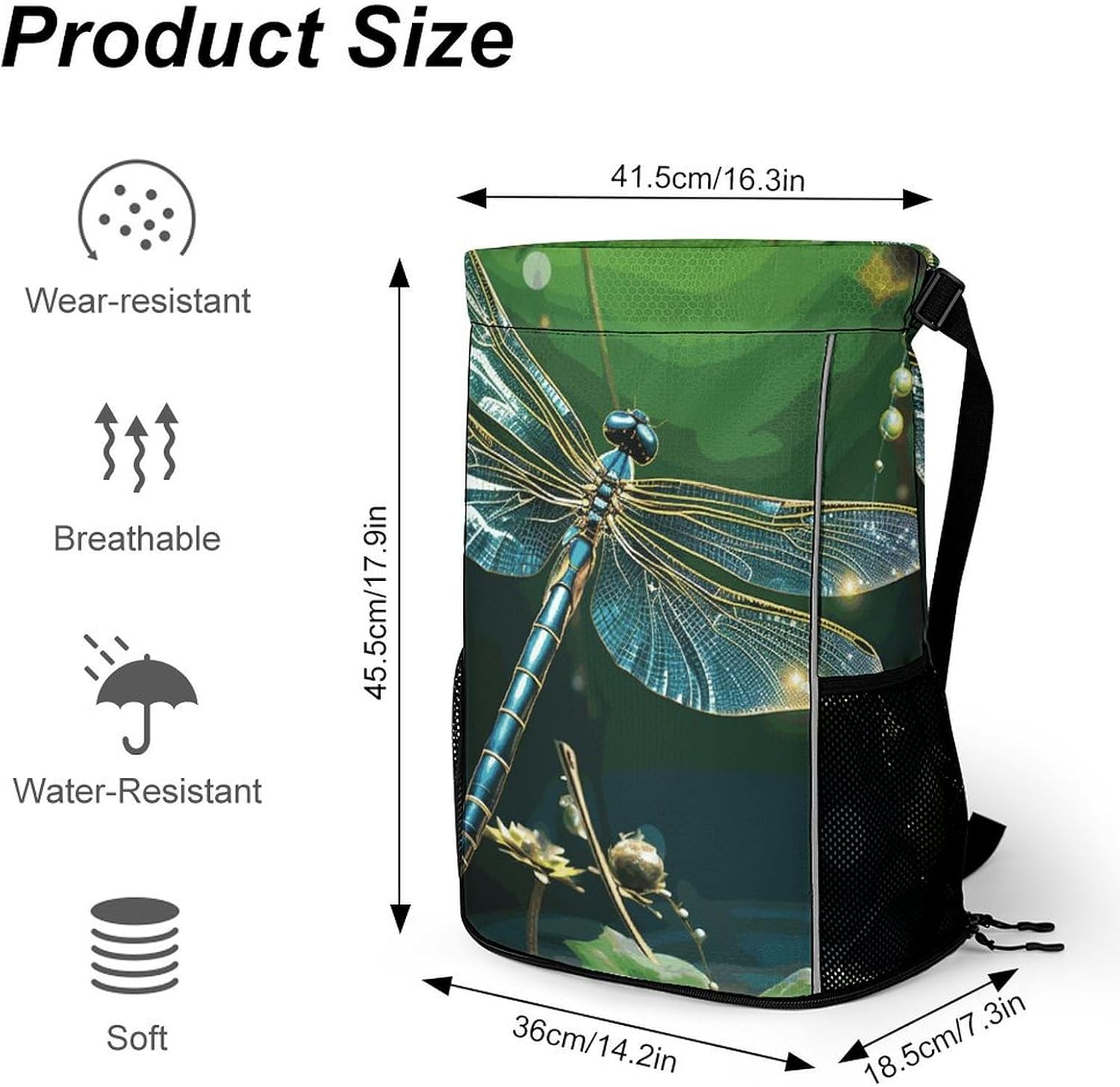 Ideal for athletes, travelers, and commuters, this drawstring backpack combines ruggedness with durability, and features a unique wet-dry separation design for sweaty sportswear or wet swimsuitsThis Dragonfly Green drawstring gym bag is also super waterproof, which can prevent items in the bag from getting wet and accidentally spilling on rainy days, making it premium for outdoor adventuresThis light backpack has a large capacity that can accommodate 2 pairs of shoes, 3 sets of gym clothes, and 1 bottle of water. If you are traveling, you can pack clothes, toiletries, and a tablet while separating wet swimsuits. For daily use, the stylish design easily transitions from the office to the gymThis workout bag is easy to care for and is machine washable (air drying recommended). Reinforced pressure points ensure it can be used for a long time