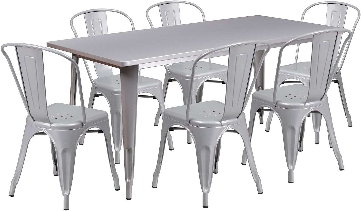 The indoor-outdoor rectangular metal table with six stack chairs will give the dining space in your home or restaurant a cool retro-vintage look. The table top measures 31.5 inches wide by 63 inches long and has a smooth top with a 1 inch edge. A stabilizing brace underneath the top gives this table increased stability while still allowing ample leg room. The bistro style chairs feature curved backs with a vertical slat, and a cross brace under the seat for added support and stability. Plastic bumpers on the cross brace protect the chairs' finish when stacking them. Drain holes in the center of the seat allow water to drain, preventing rust. The smooth, powder coat finish protects the set from scratches and floor glides protect your floors when you need to move it. Designed for both commercial and residential use, this trendy table set will create a lasting impression.