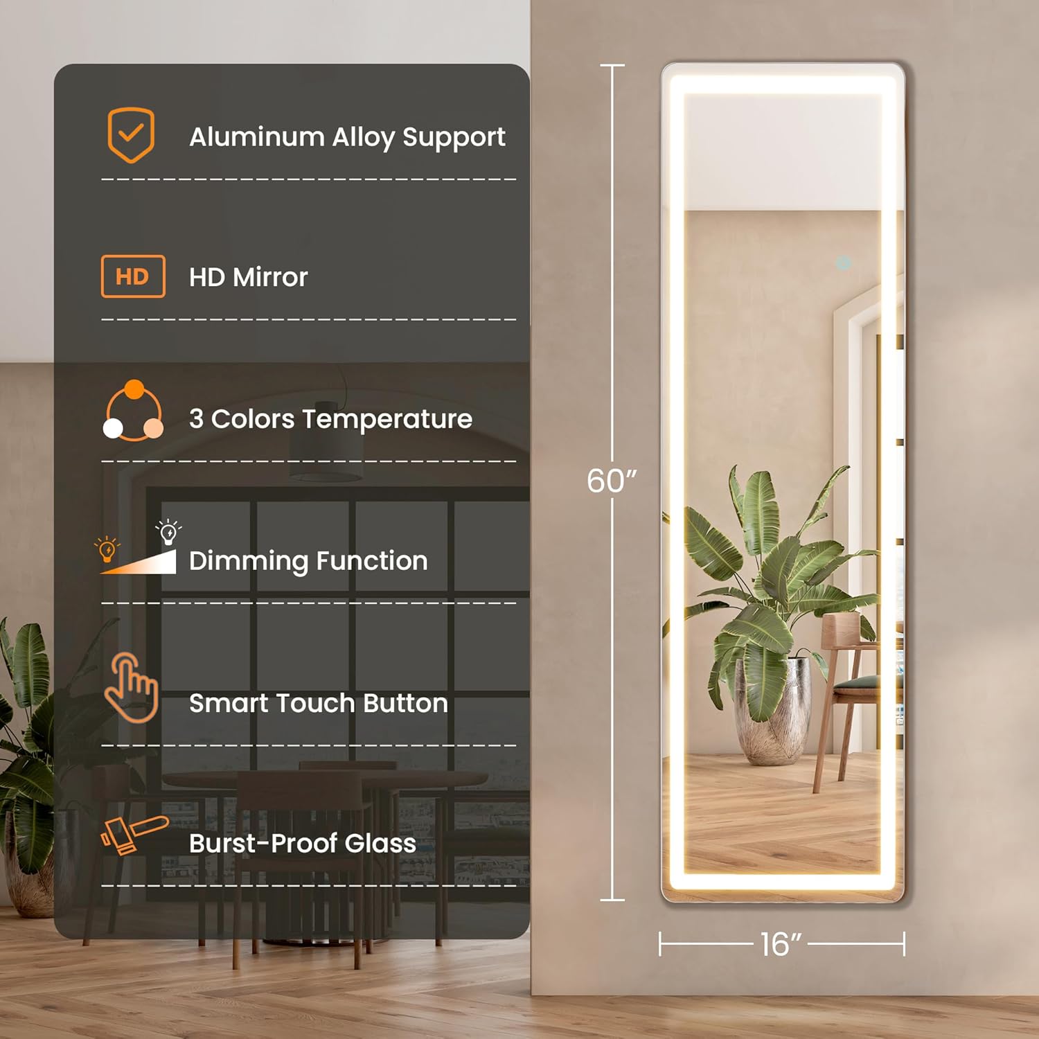 Size: Three sizes: 64" x 21", 63" x 20", 60" x 16" Color: The LED light mirror is surrounded by a silver frame, which makes the whole mirror look noble and elegant, bringing a symbol of wealth to your warm home. Features: This mirror is made of high-quality aluminum alloy frame and nano explosion-proof glass. Even if it is accidentally damaged by external force, the fragments of the mirror will not fly around, please use it with peace of mind. Packaging: We have improved the packaging method. Accessories and foam are placed in the packaging box to ensure that the product will not be damaged during transportation. Mirror usage scenarios: The light mirror can be placed in the living room, bedroom, cloakroom, dressing room, gym and other places, or it can be hung on the wall.