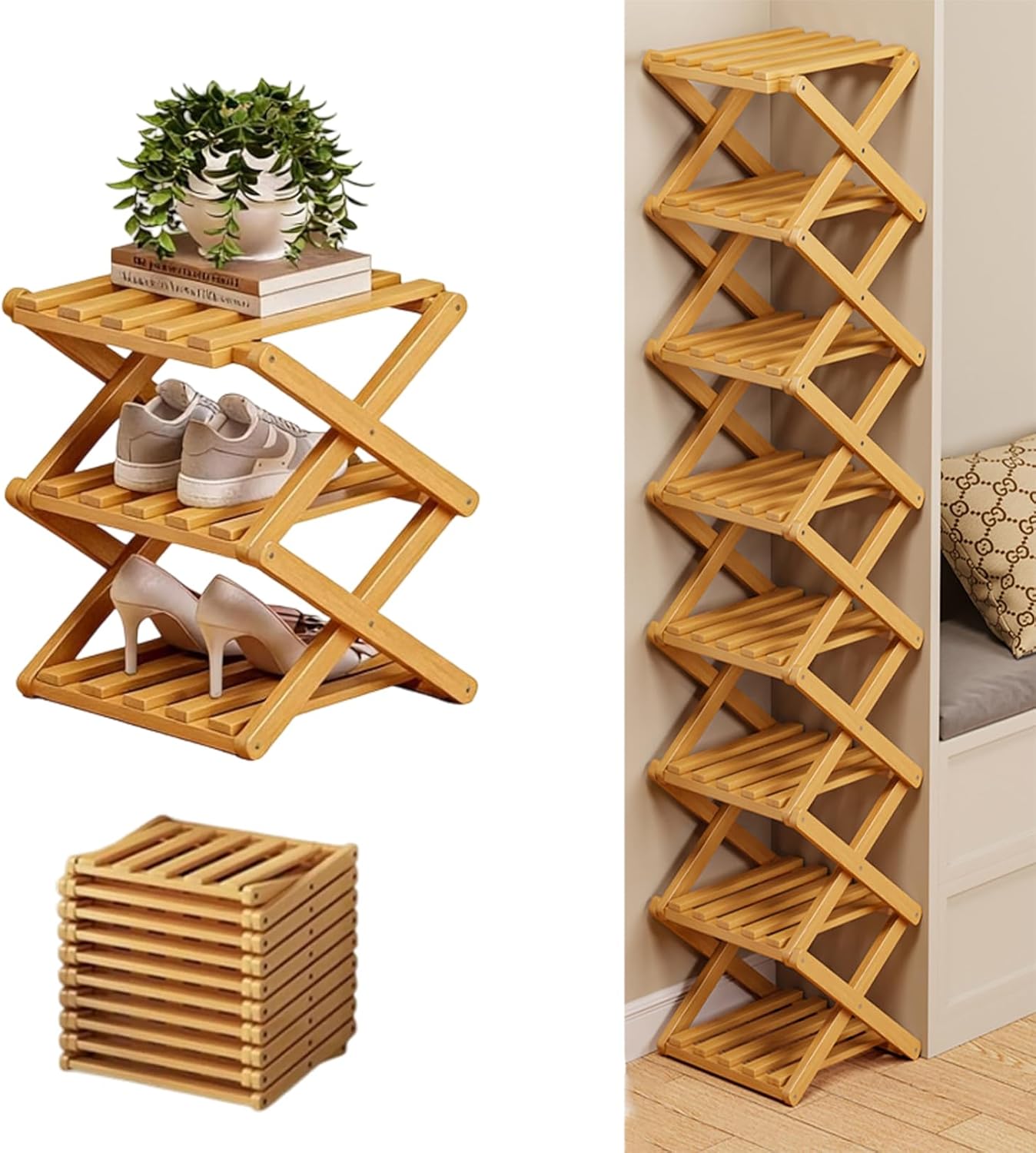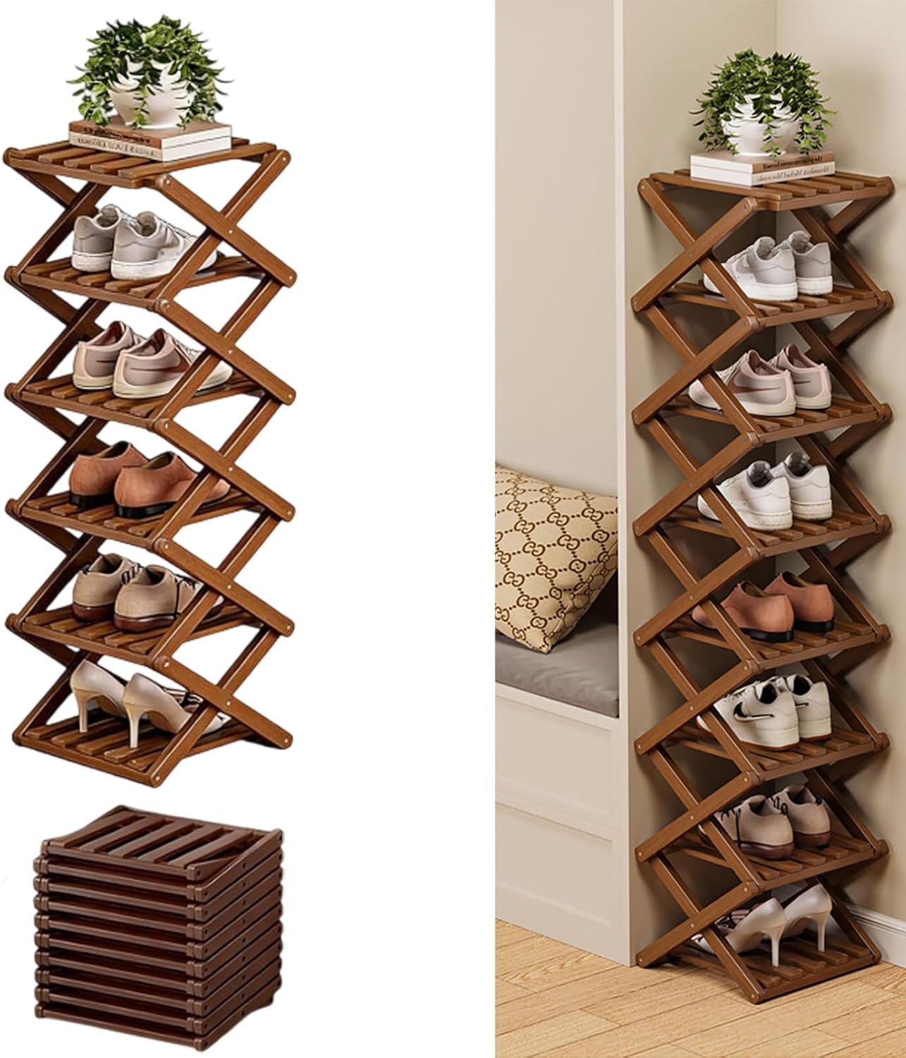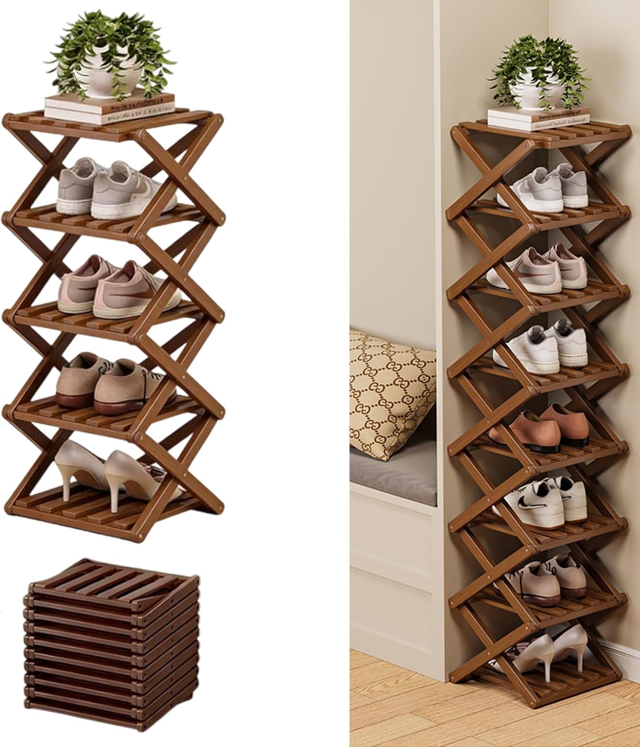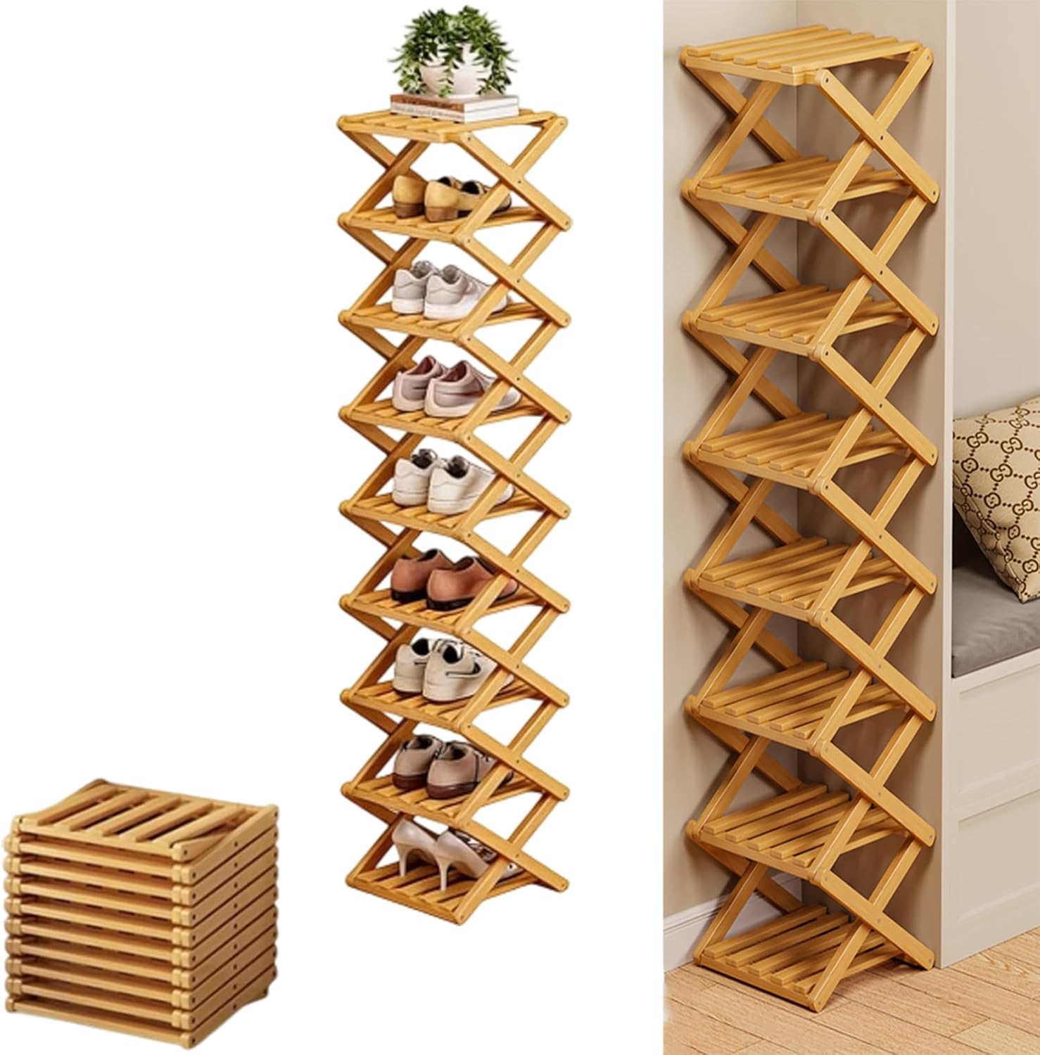 Product Features:Material: Natural BambooSize: 2-10 layers available, height adaptable to different shoe stylesColor: natural/brown Structure: Foldable, No Assembly RequiredDesign: Vertical Narrow Freestanding RackPracticality: Suitable for narrow spaces such as entryways and dormitories; vertical storage increases capacity by 50%Usage Scenarios: Suitable for international students who move frequently, short-term rental apartments, especially suitable for families in high-humidity areas such as Southeast Asia and South America; matches modern interior design styles such as Scandinavian and Japanese styles*Package List: No-installation folding shoe rack *1