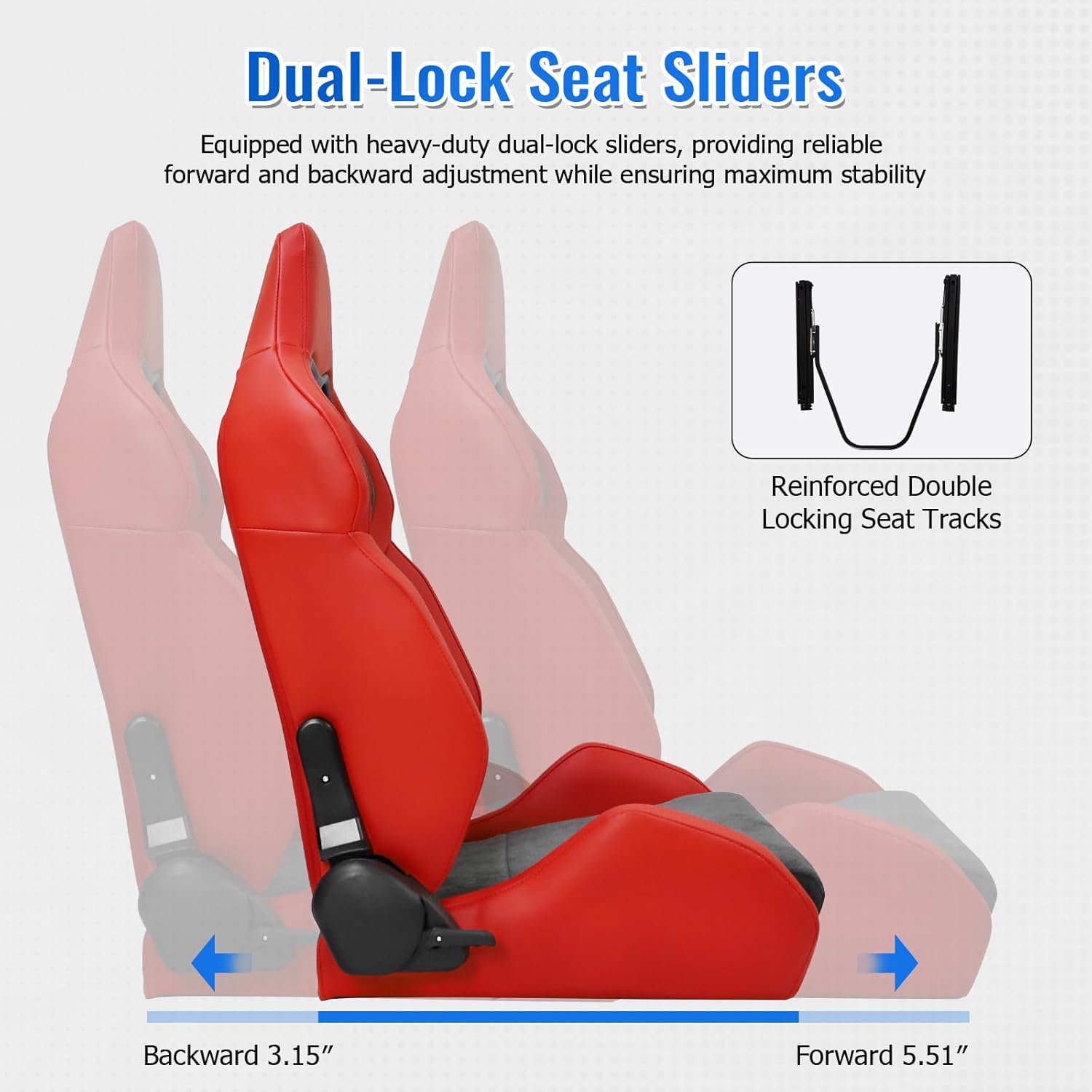 Upgrade your ride with this universal fit reclining racing seat, engineered with premium materials and ergonomic design for lasting comfort and performance style. The PU + synthetic suede front combines resilience with a soft, upscale finish, while the full PU back adds strength and a professional look. Inside, a steel tubular frame offers solid stability, and injection molded foam sponge provides long-term comfort for both daily commuting and spirited driving. This seat features a fully reclining function, allowing you to fine-tune your seating angle for maximum relaxation or performance. The aggressive bucket-style design provides excellent lateral support, keeping you secure during sharp turns. Compatible with most cars, trucks, and SUVs, it’s the ideal upgrade for enthusiasts, everyday drivers, and track-day racers. Key Features: Front Material: PU + Synthetic Suede (Durable, refined, easy to clean) Back Material: PU (Strong, sleek appearance, wear-resistant) Internal Structure: Steel Tubular Frame + Injection Molded Foam Sponge Reclining Function: Adjustable backrest angle (45°-160°) Universal Fit: Fits cars, trucks, SUVs (Mounting brackets are required) Harness Compatibility: Shoulder slots for 4 point harnesses Included: 2x Racing Seats (Driver & Passenger) + 2x Locking Sliders, Mounting Hardware Notes: * Compatible with the front Seats, Not compatible with rear seats! * No air bags, Not work with vehicle original sensors! * Custom seat brackets (purchase separately) required for installation!