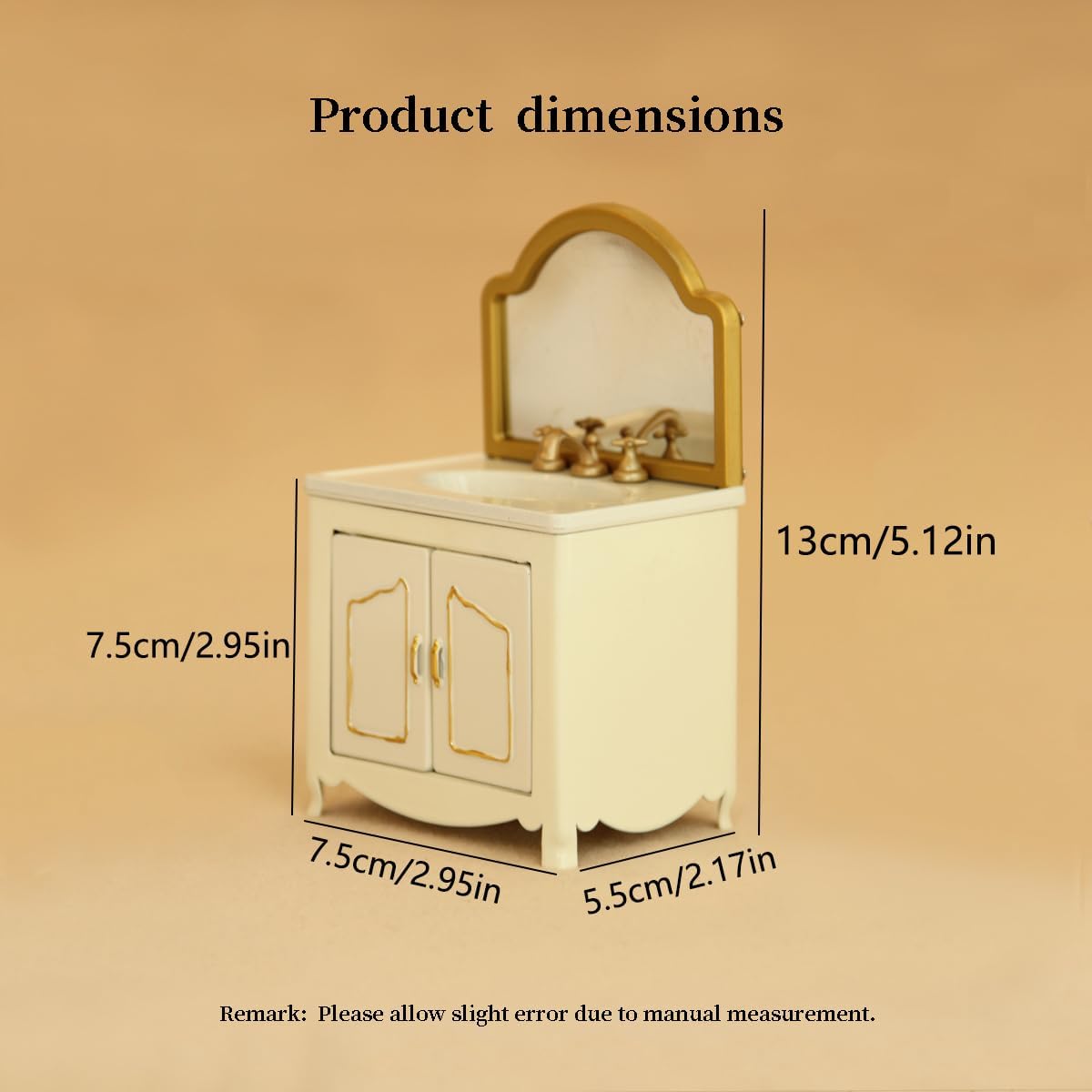 Elevate your 1:12 dollhouse bathroom with this French luxe vanity—crafted from sturdy iron with a cream white finish, accented by elegant gold trim (frame, faucet, handles) for a sophisticated, timeless look. Featuring a built-in sink and double storage doors, it adds both realism and functionality to mini bathroom setups. Perfectly sized for 3–6" 1/12 BJD dolls, it fits seamlessly into dollhouse scenes with no extra accessories needed—unbox and style instantly. Ideal for durable dollhouse decor, premium mini photography props, or gifting to miniatures enthusiasts who love luxury-inspired, sturdy iron dollhouse furniture