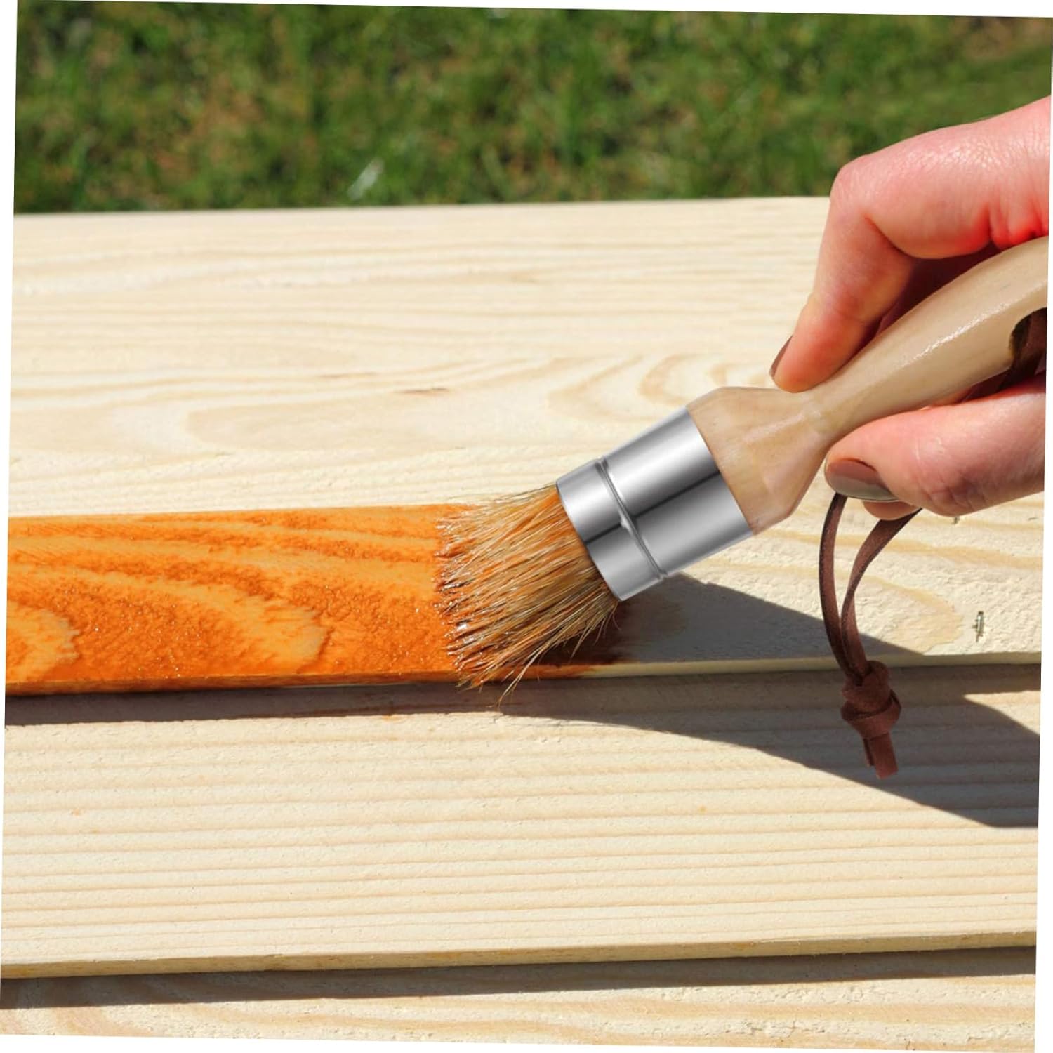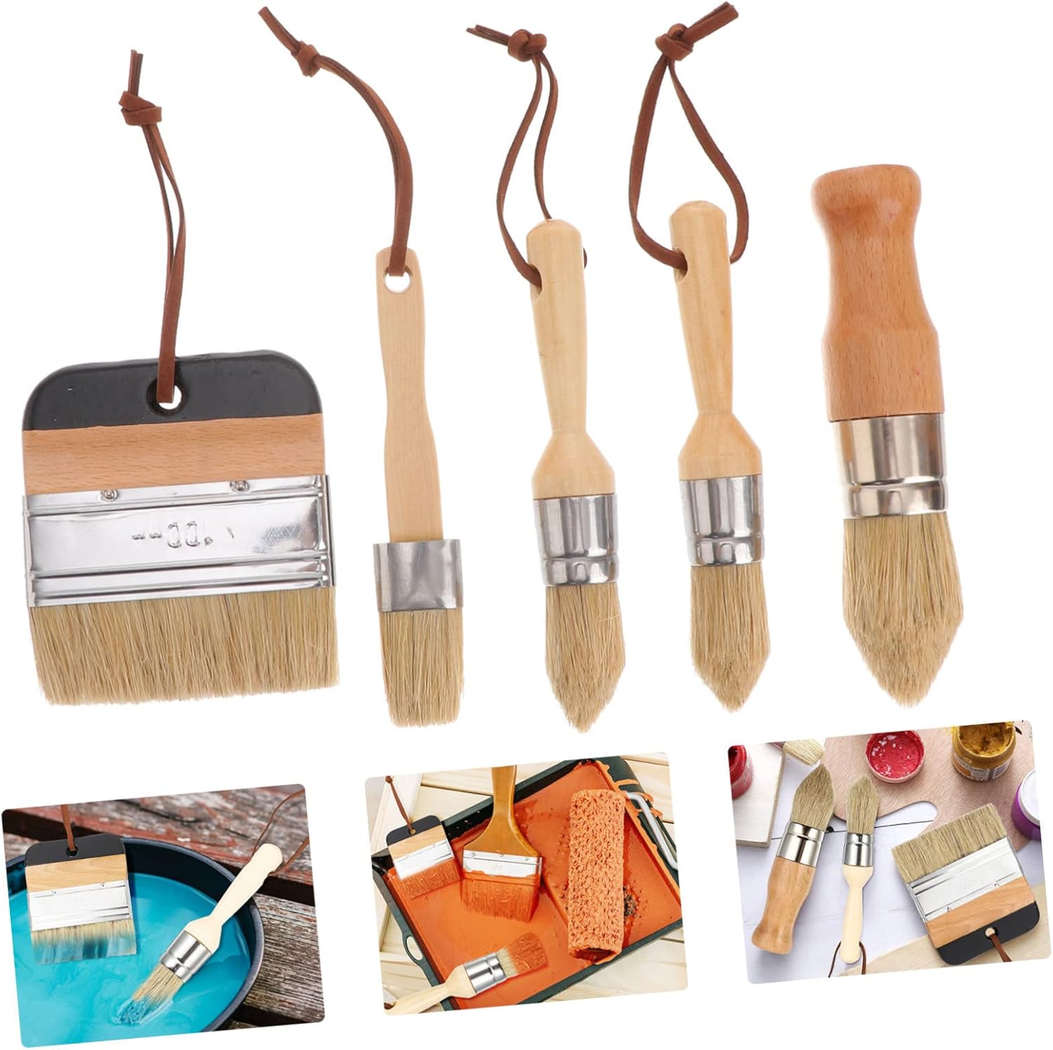 Package Include 5 x paint Features -Color: As Shown Wood Handle Brush -Size: 12.00X10.00X1.00cm/4.72X3.93X0.39in Home Decor Brush -Material: Wood, bristle,aluminum alloy Glue Paint - Connected by aluminum alloy, sturdy andnot easy to break paint brush. - Helping you to finish your painting jobefficiently wax Paint Brush. - Comes with 5pcs different paint brush different needs for Paint. - It has leather hanging straps, hanging iteasily after using Wood Handle. - Fit for painting surfaces, such as tables, furniture, chairs, cabinets, dressing tables, interior decoration, walls, ceilings, etc artiste.Goods DescriptionWood Handle Brush Really practical and useful, widely used for tables, dressingtables, chairs, furniture, cabinets, and etc.artiste want a kind of wooden bristle paintbrush kit? want to paint your wall or furniture easily? This can be yourbest choice