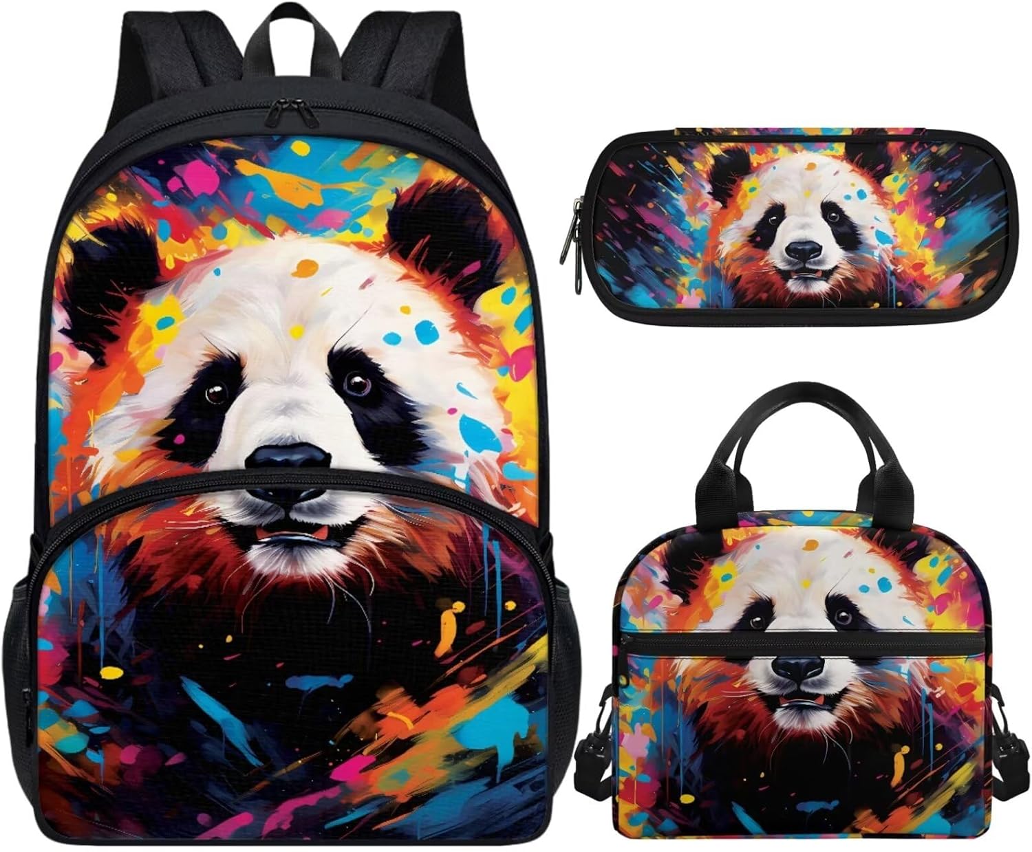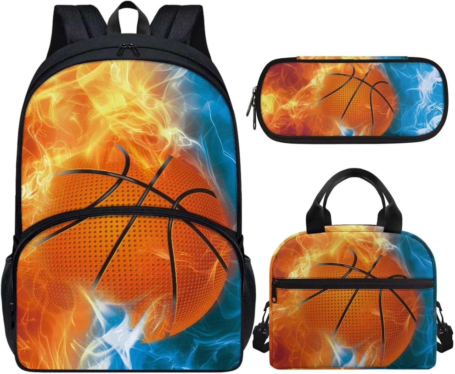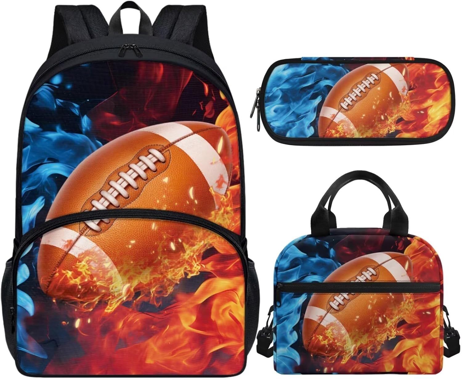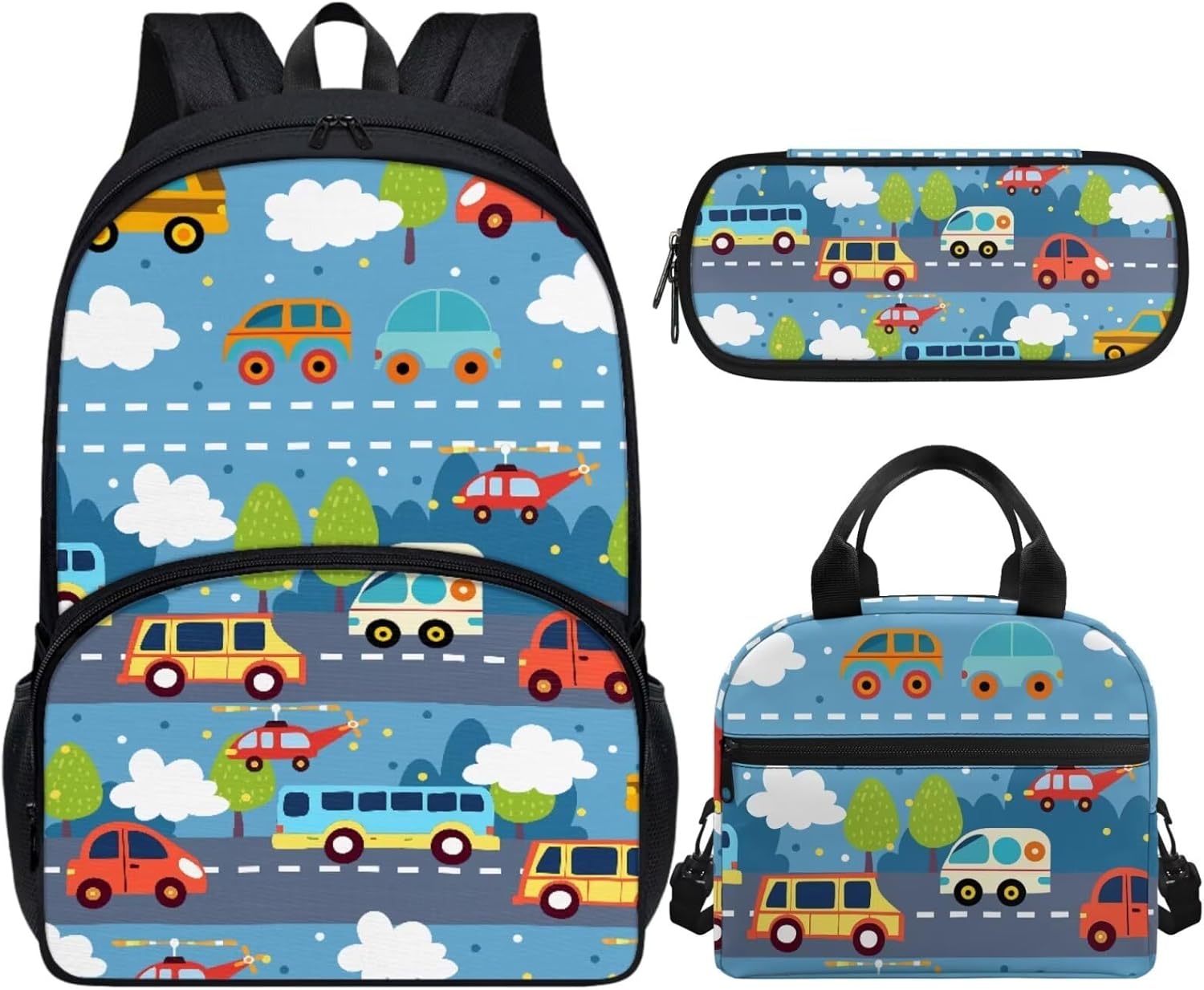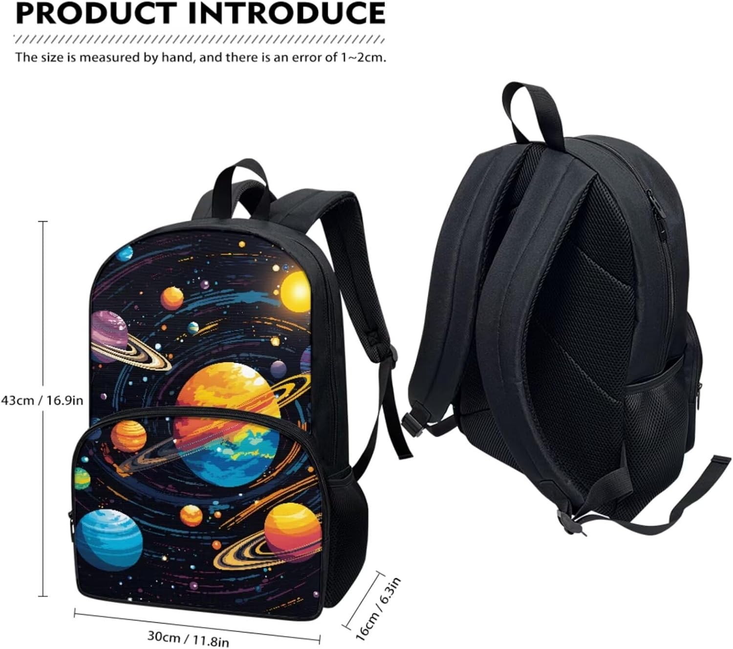 3 Piece Backpack Set for Girls Boys School Bag with Pencil Case Lunch Tote Bag Backpack: 16.9"x6.3"x11.8". The backpack are made of lightweight polyester material, easy to clean; 1 Front Zipper Pocket; 2 Side Pockets for water bottle and umbrella; Smooth zipper; Widened and thickened shoulder straps make it feel nice and comfortable.